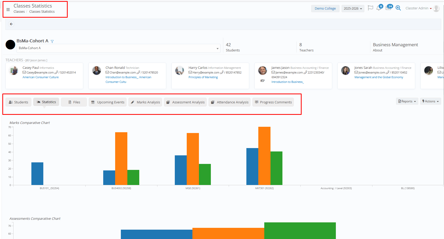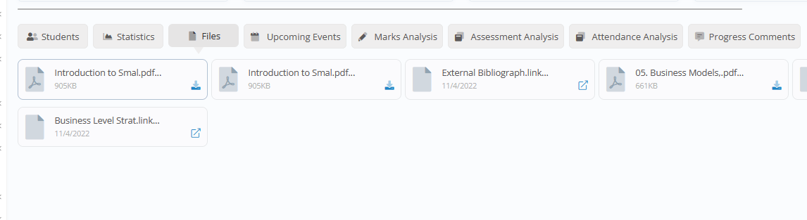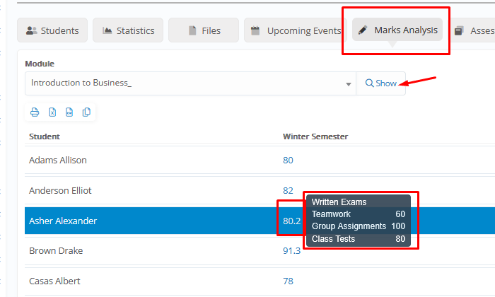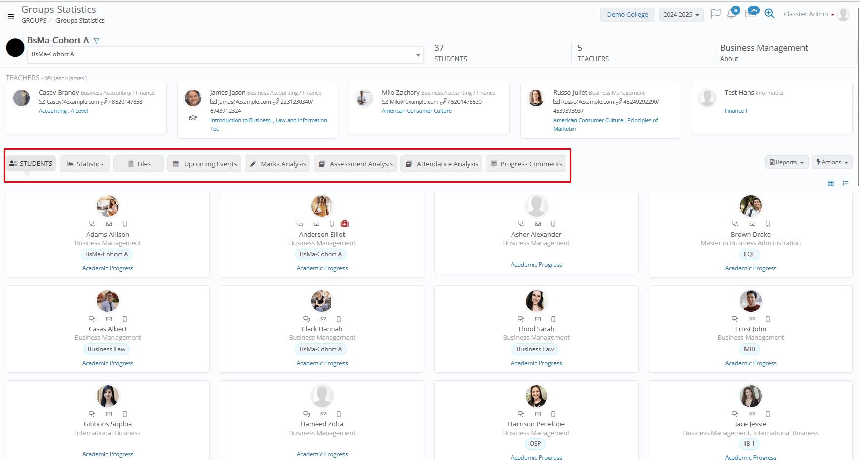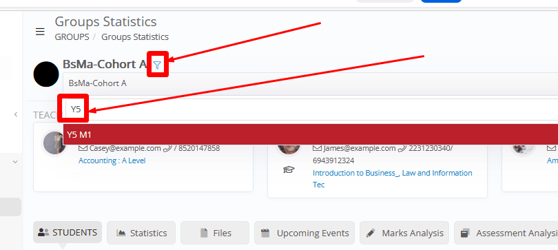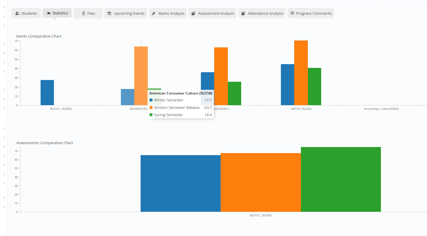 - Additional Tabs with Gradebook / Assessment Marks Charts, Group Files, Upcoming Events (Assessments, Quizzes, etc.), Gradebook Marks / Assessment Marks and Attendance Analysis, and Group’s current Progress Status and Comments.