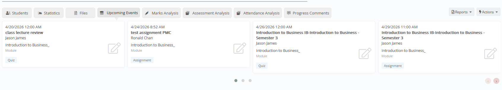 - Upcoming Events: View of scheduled upcoming assessments, assignments, quizzes, homework, and deadlines.