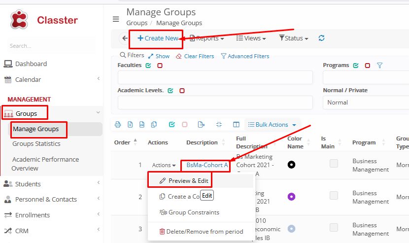 You can create a New _Group_ using the relevant option at the top of the list of groups, or edit existing groups by clicking on their Title in the list (or using the option: Actions > Preview & Edit.