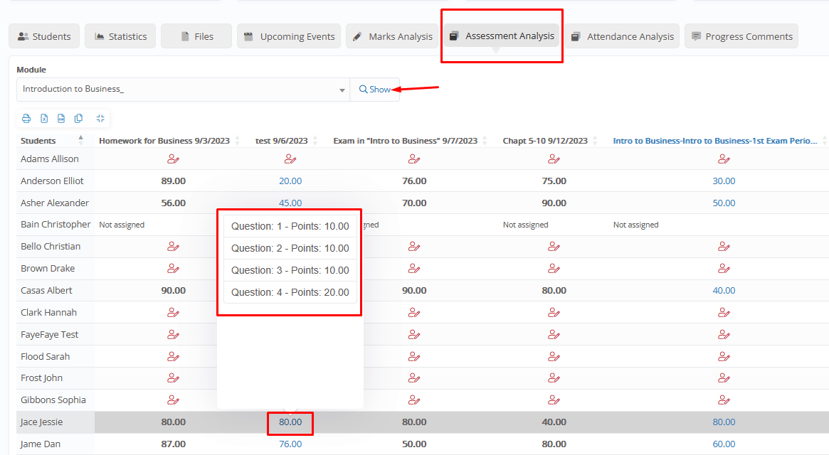 Assessment Analysis: A view of the results of all assessments, assignments, and quizzes of the group per subject. For quizzes, a quick view of the questions is also available when hovering over the mark.