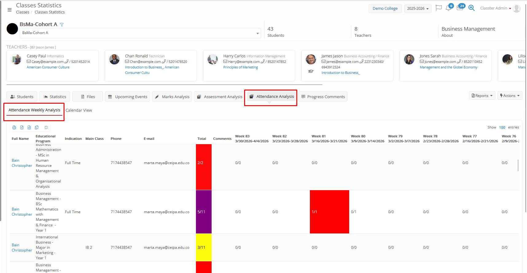 - Attendance Analysis: View of all attendance records (absences/presences) with 2 view options, all student totals per week, or individual student records per day.