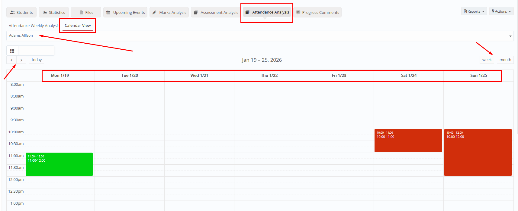 - Calendar View: A calendar view of absences/presences per student, showing the records of each day, with the ability to show in Weekly or Monthly view.