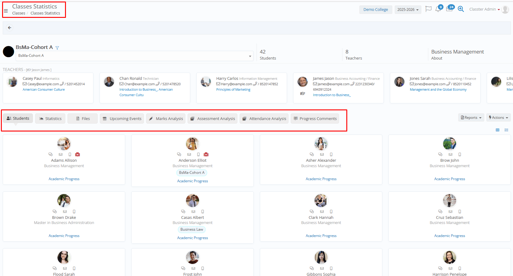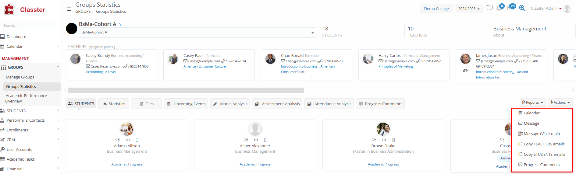 - Students: Displays the list of students enrolled in the _Group_ (any _Subject_), in card view, with quick actions and views available, such as send message/email/SMS and medical info.