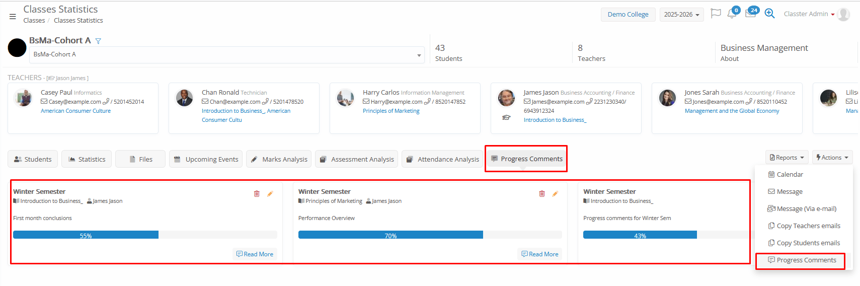 - Progress Comments: Displays academic progress notes and teacher feedback recorded for each group and subject combination, including the current progress ratio as well. You can view and edit from this Tab.