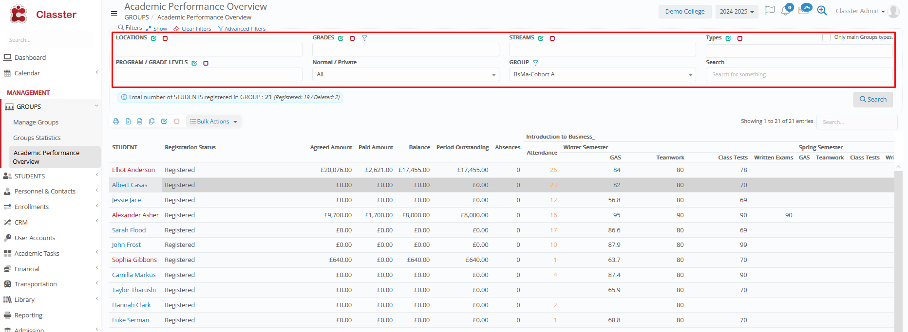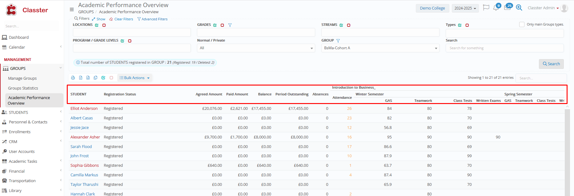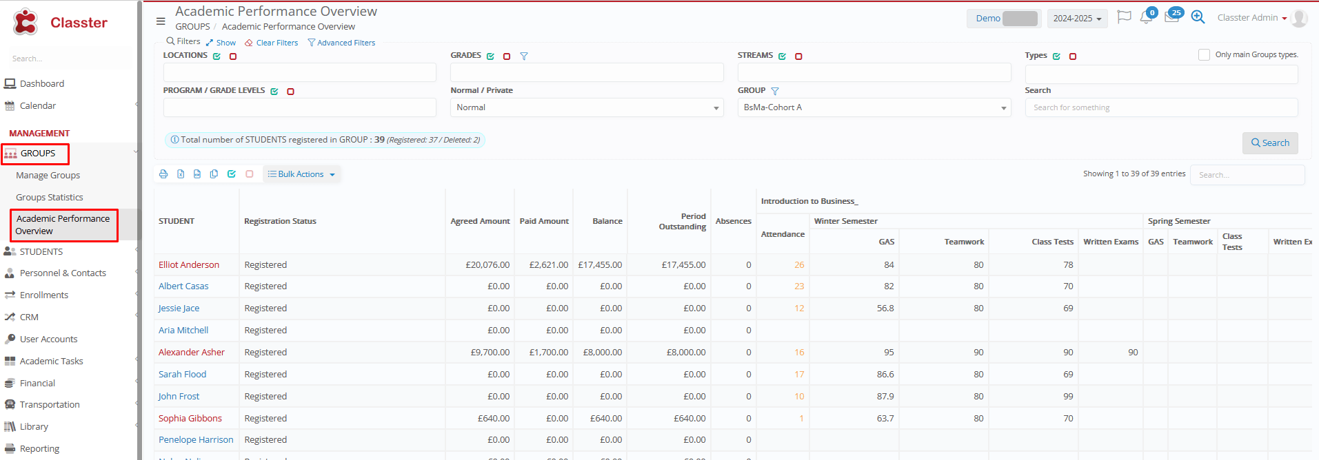 The Academic Performance Overview provides a centralized dashboard for monitoring and analyzing student payments and performance (attendance, marks, across all subjects and marking periods) for the selected group.