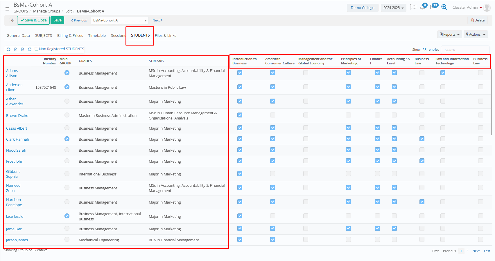 The system will automatically inherit all the subjects found, which are active and connected to the same _Grades_/Programs and _Streams_ with the group.