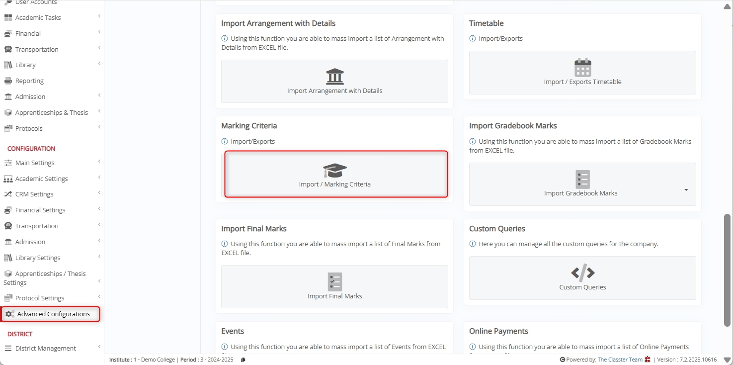 Log in to your Institute and go to: CONFIGURATION > Advanced Configurations > Mass Imports / actions > Import Marking Criteria.