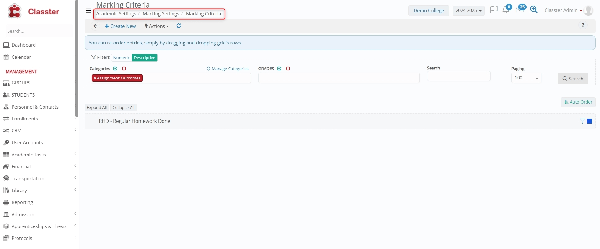 To review the imported Marking Criteria, navigate to: Academic Settings > Marking Settings > Marking Criteria.