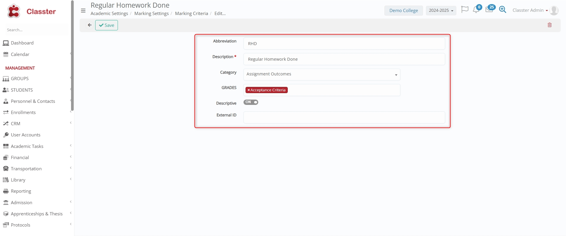 - Category: Defines the classification or type of the Marking Criterion (e.g., Assignment Outcomes).
