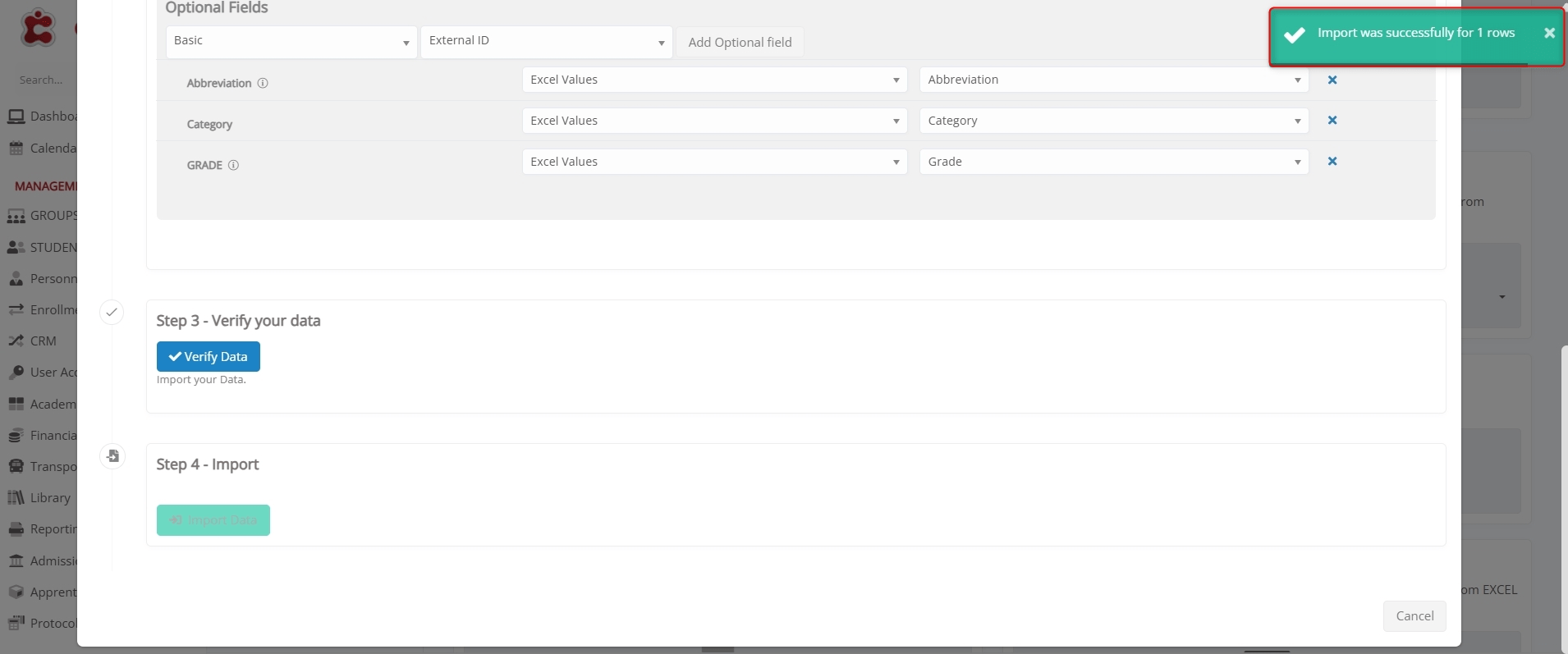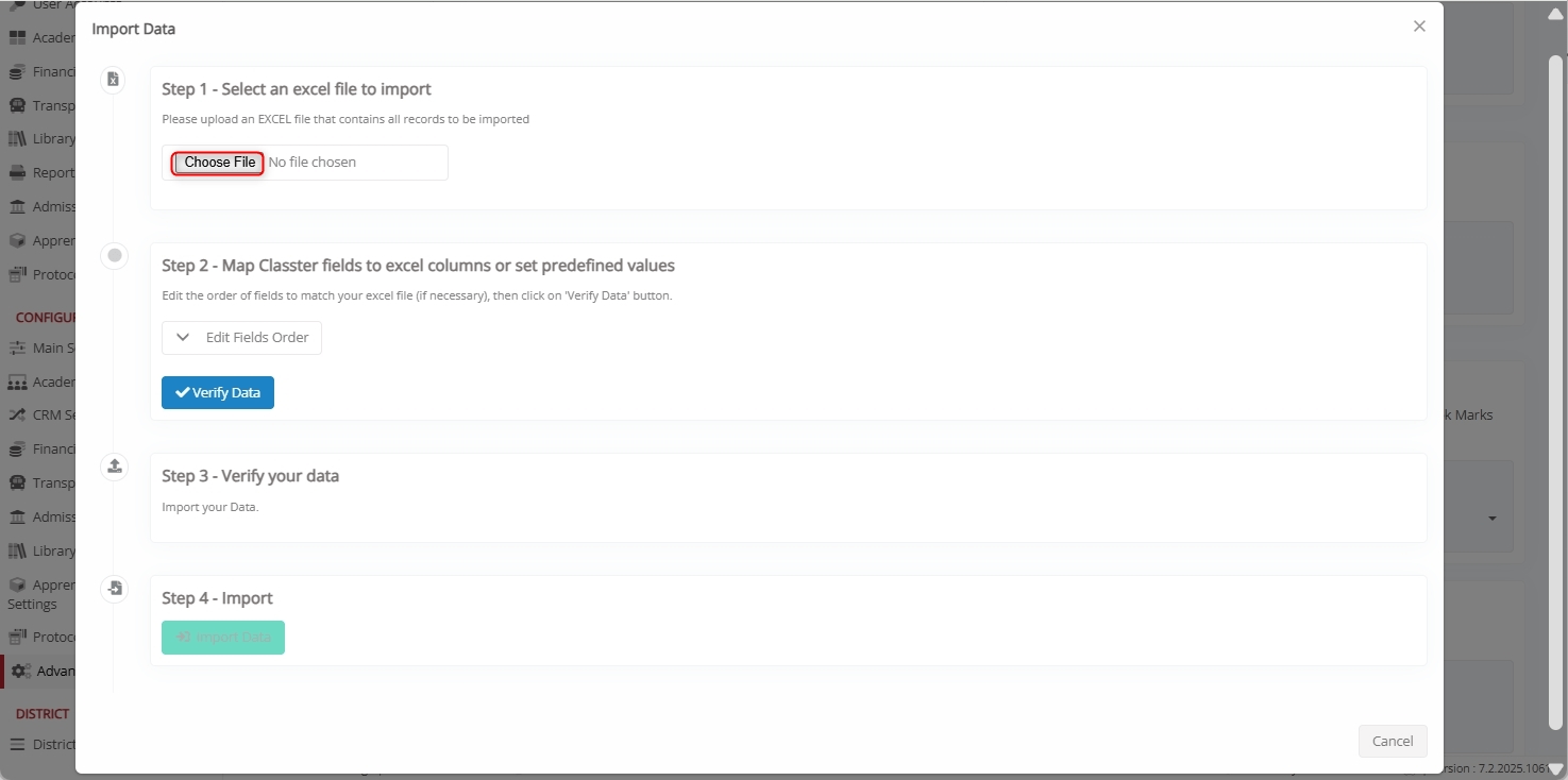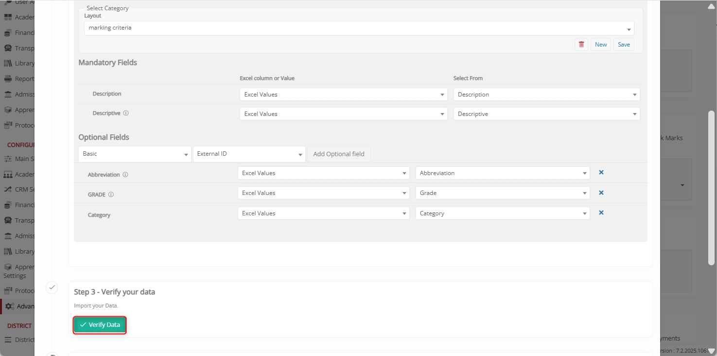 After completing the field mapping, click Verify Data to validate the uploaded records. Classter checks for missing fields, invalid values, or duplicates before finalizing the import.