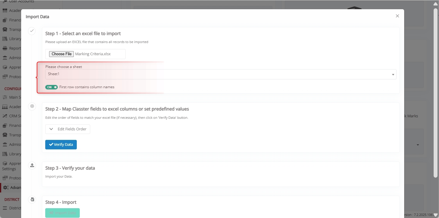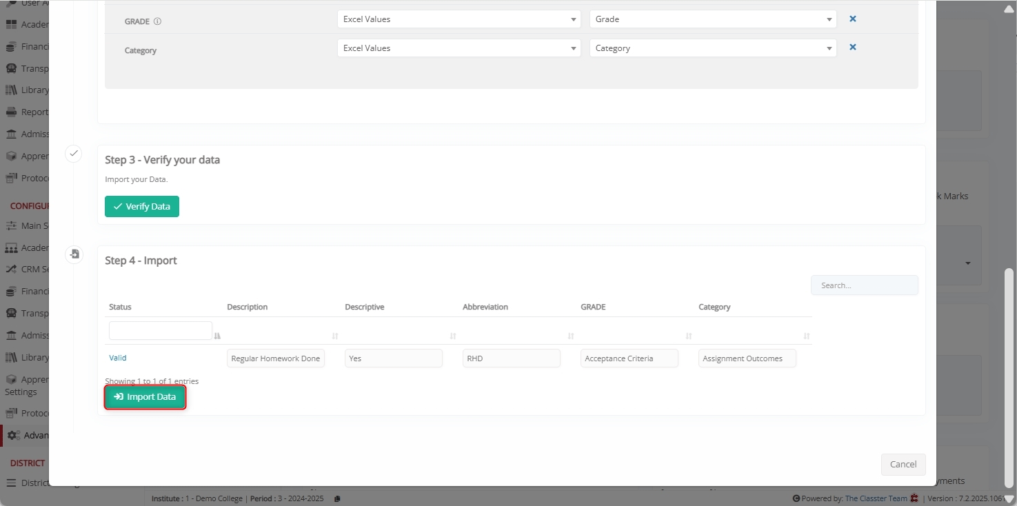 By following these steps, institutions can efficiently import Marking Criteria into Classter. Accurate Excel formatting, correct field mapping, and thorough validation ensure smooth and error-free data import, supporting consistent grading and evaluation setup across all academic levels.
