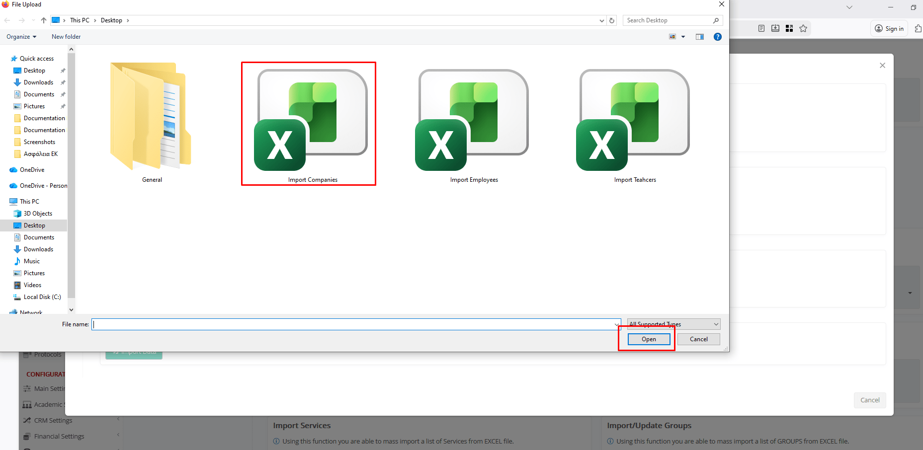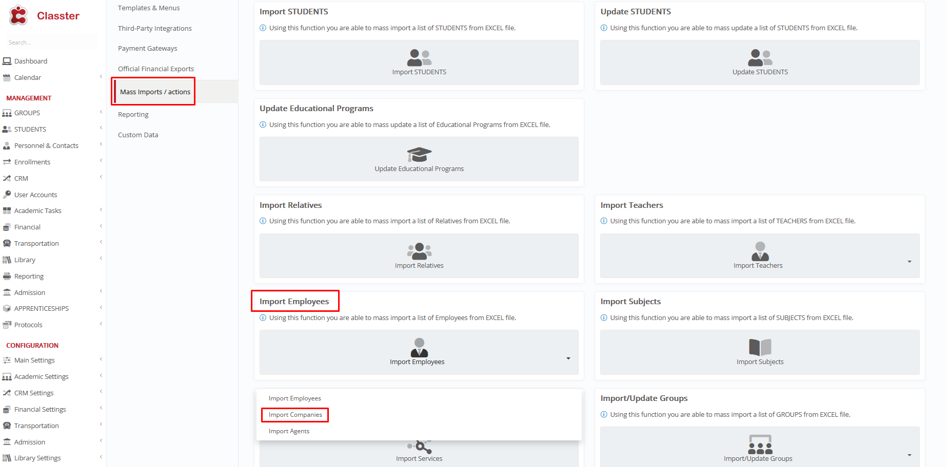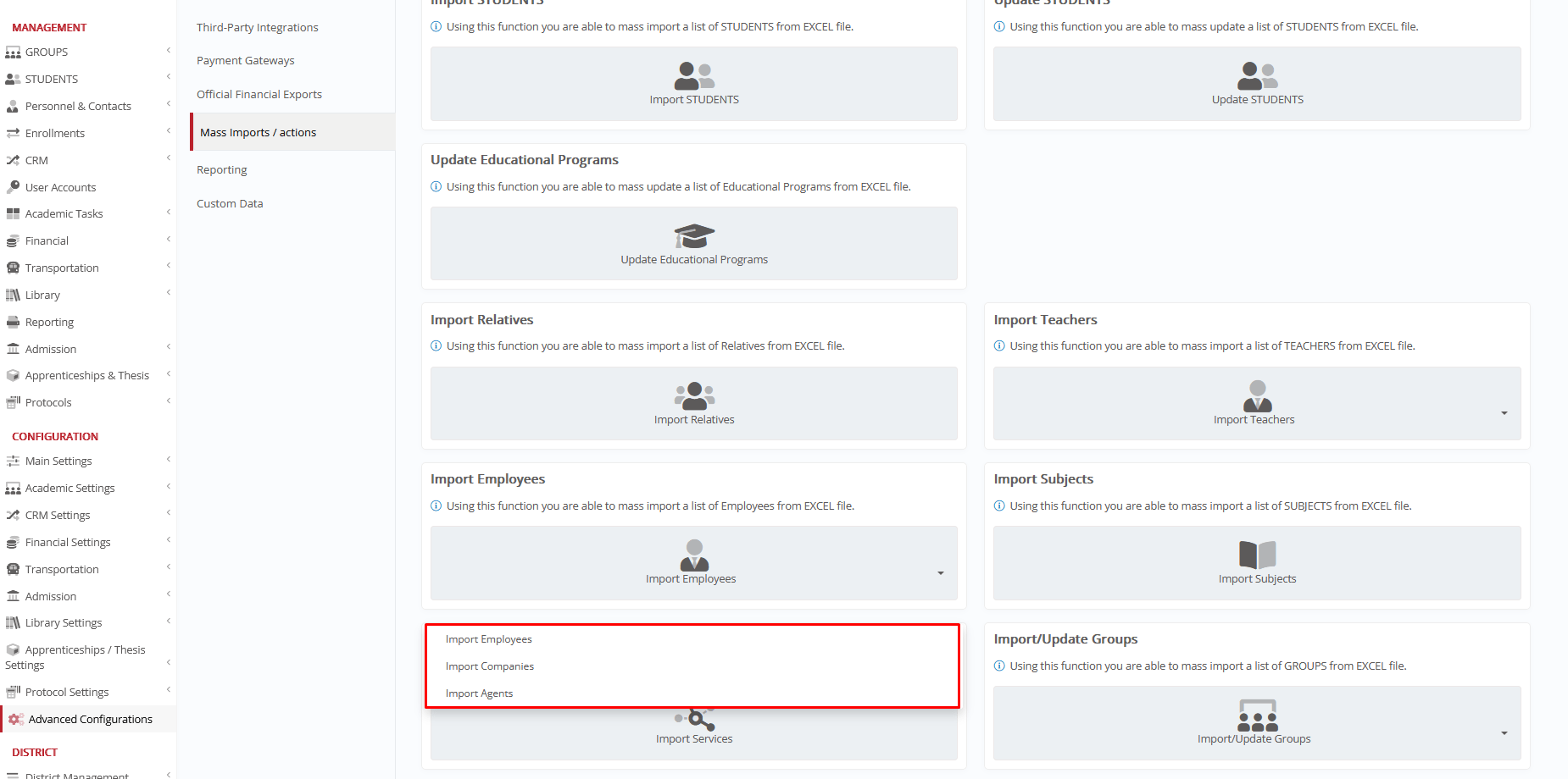 Log in to your Institute and navigate to: CONFIGURATION > Advanced Configurations > Mass Imports / Actions > Import Employees menu > Import Companies.