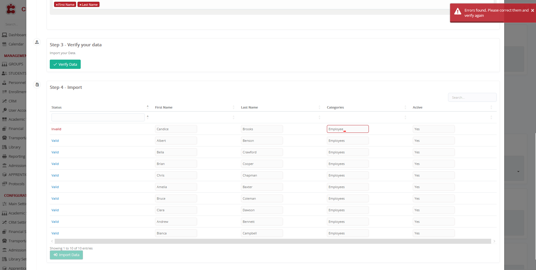 If errors are detected (e.g., missing fields or incorrect column formatting), Classter highlights the corresponding fields in red for correction.