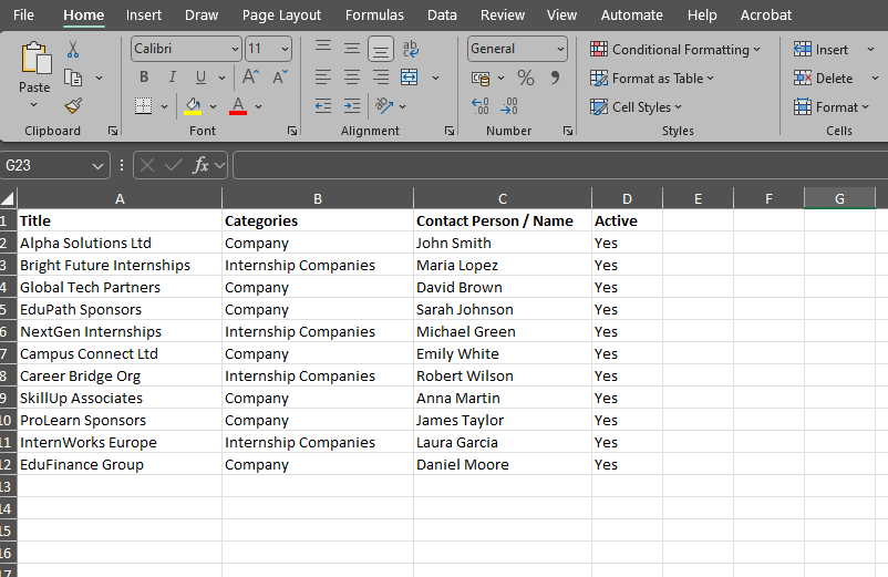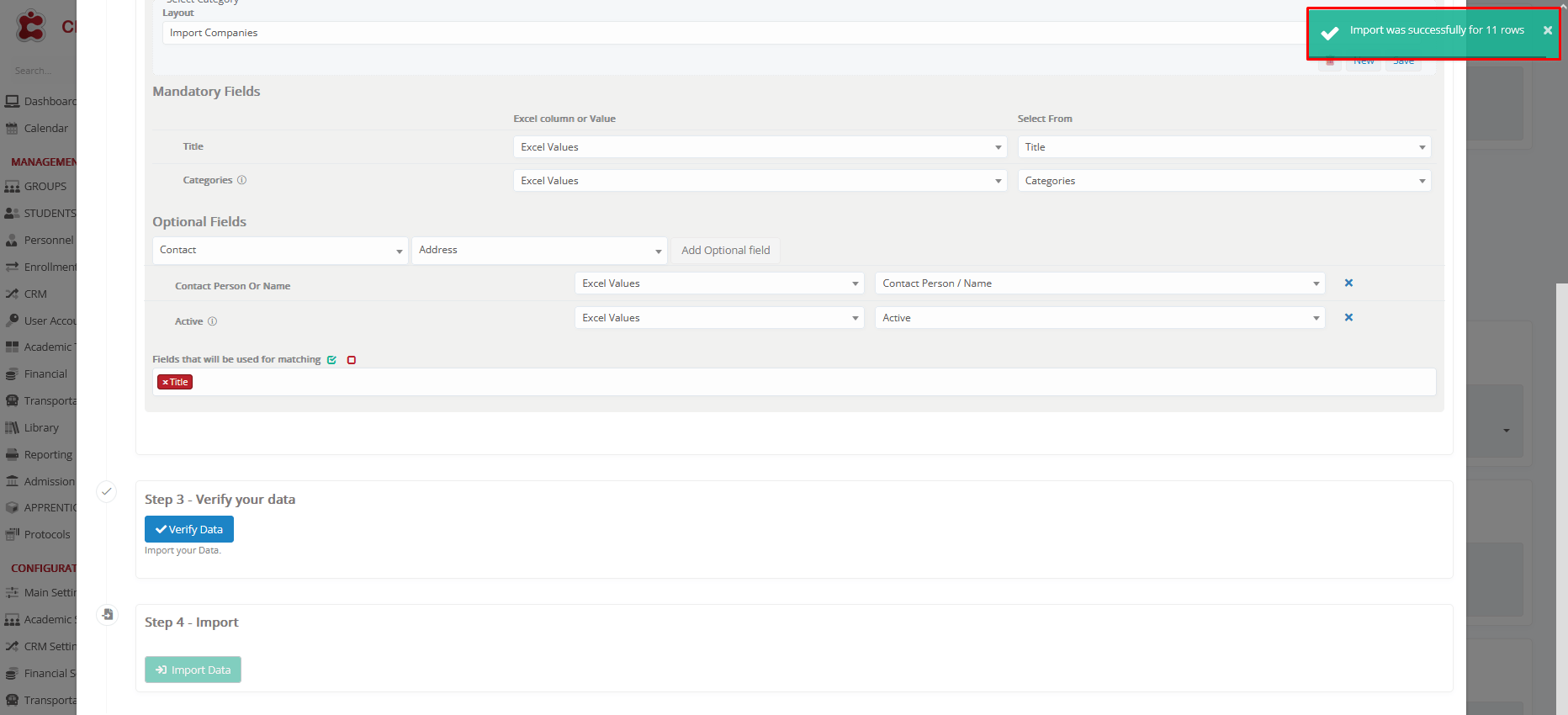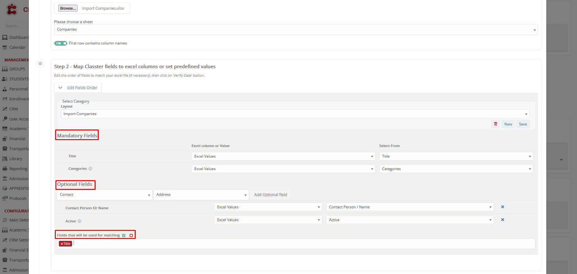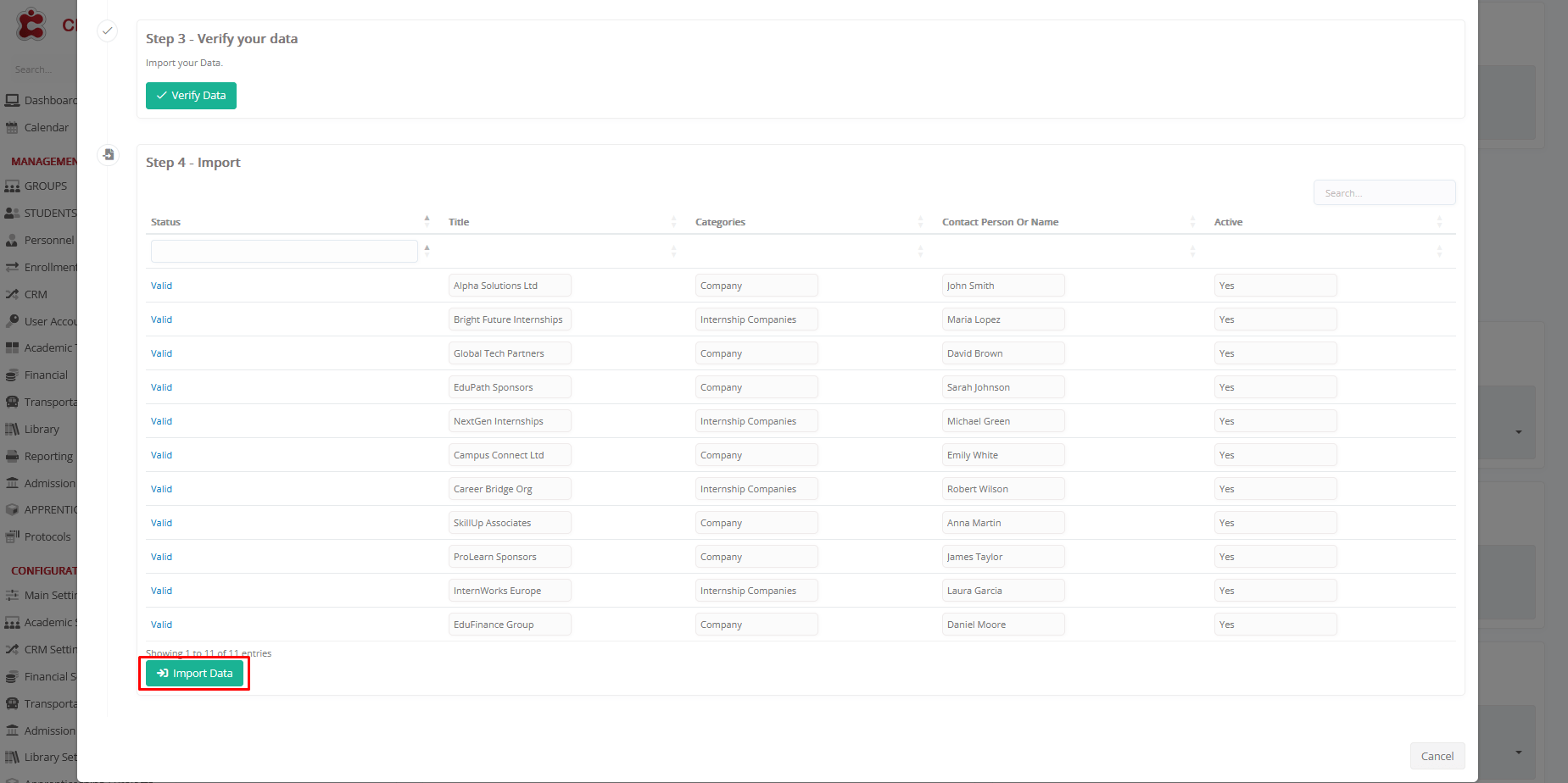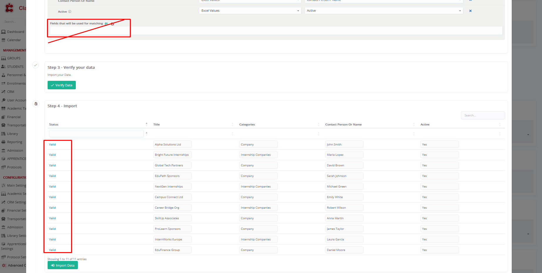 - Import Companies: Used to add Company records, including external partners such as _Internship_ providers and other collaborating organizations.