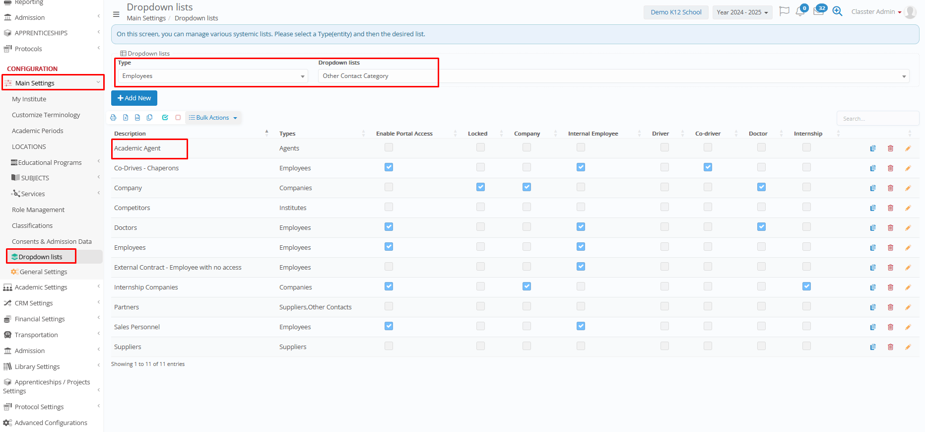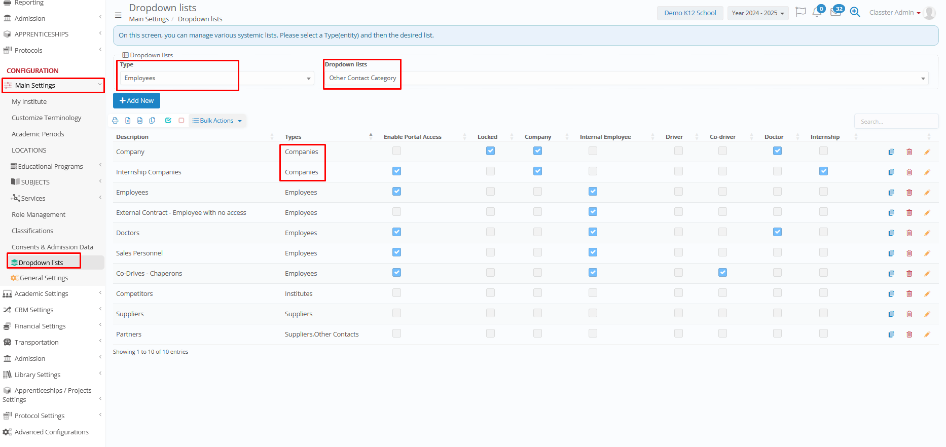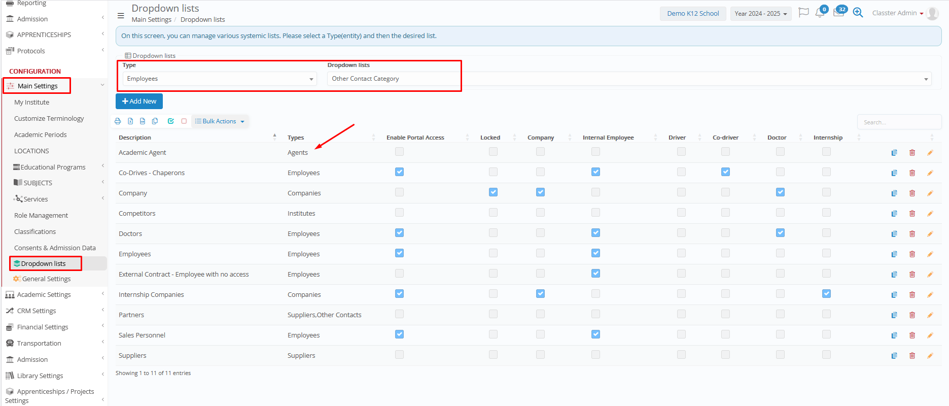 The available Company Categories can be found at: Main Settings > Dropdown Lists > Type: Employees & Dropdown Lists: Other Contact Category