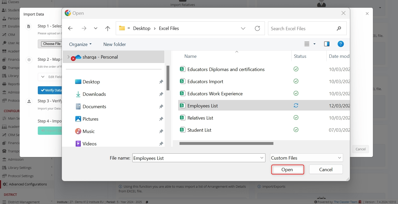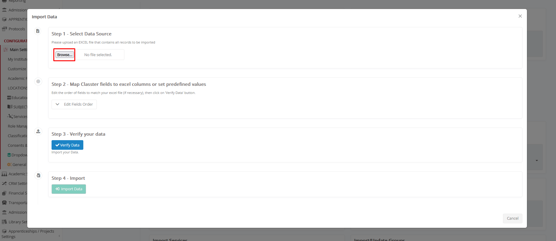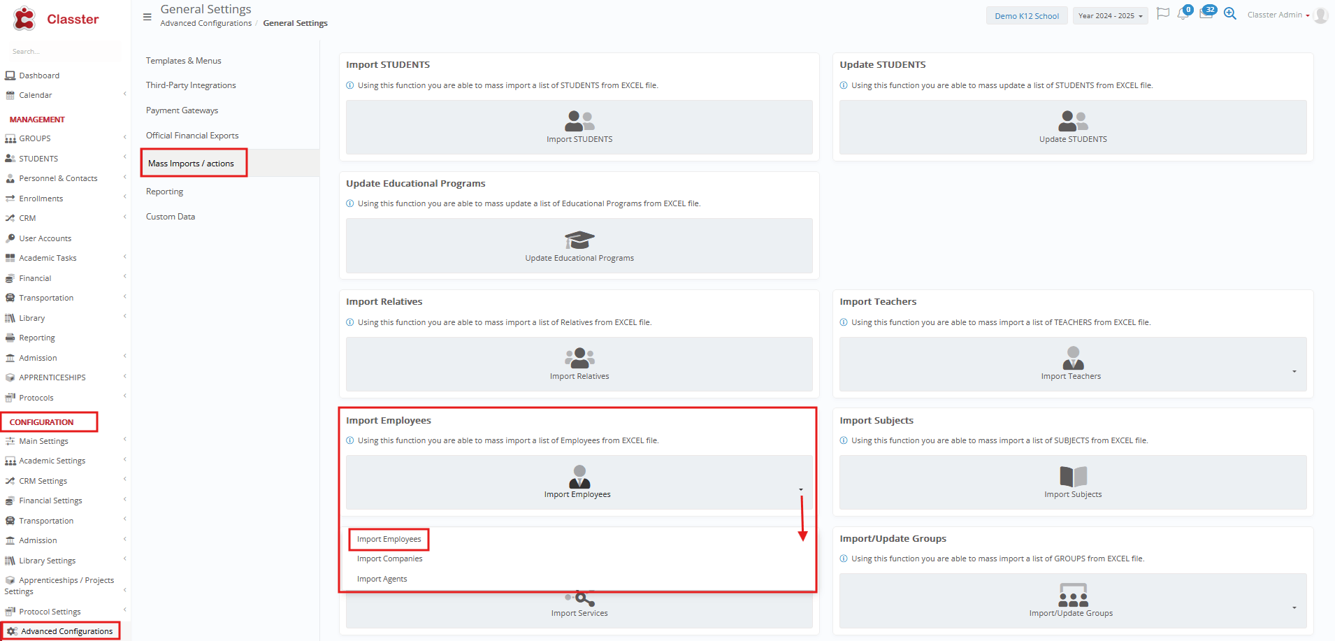 Log in to your Institute and navigate to: CONFIGURATION > Advanced Configurations > Mass Imports / Actions > Import Employees menu > Import Employees.