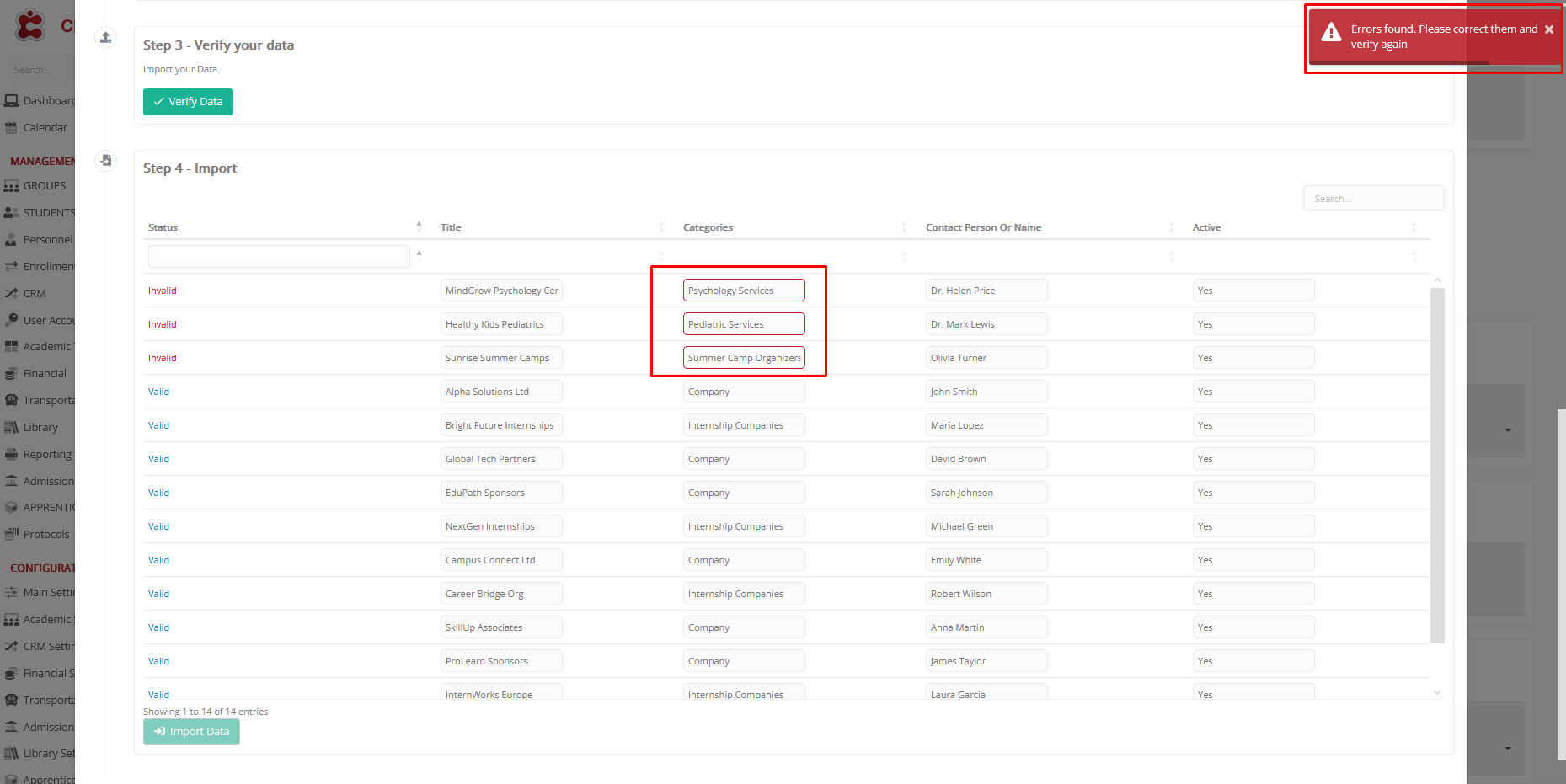 As a result, the import fails validation and cannot proceed until the Categories value is corrected to an existing option (e.g., Company or _Internship_ Companies) or until the missing Categories are first configured in the system.