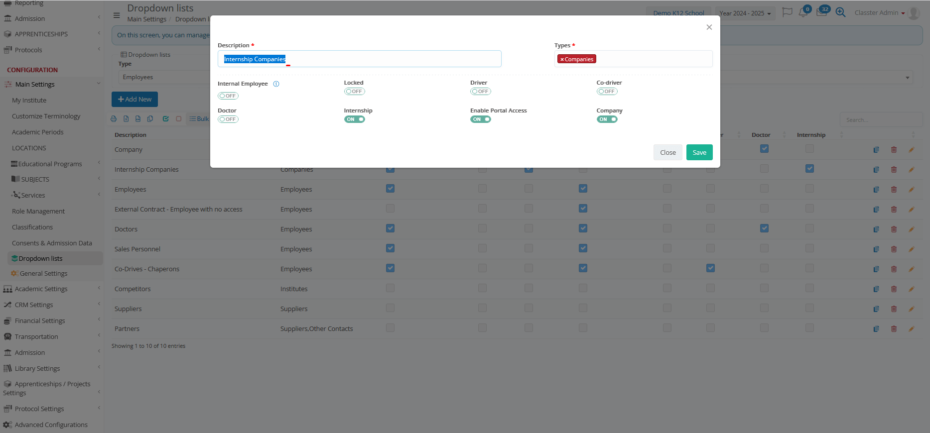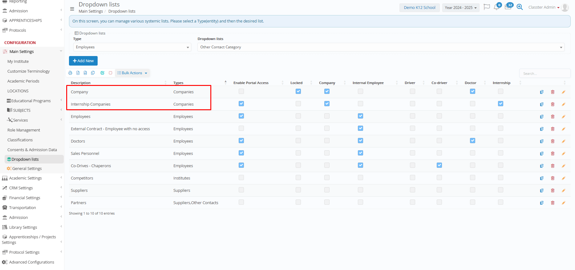 The selected value defines how the Company record is categorized and used within Classter. Categories may include a generic option such as Company, or more specific categories like _Internship_ Companies, depending on your institution’s configuration and workflows.