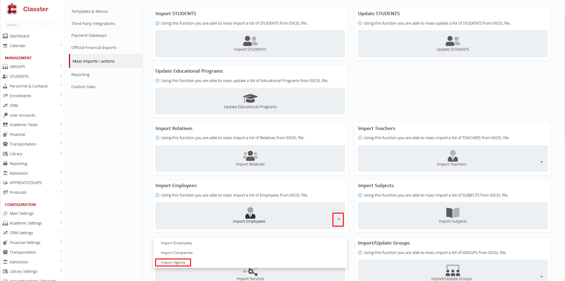 Log in to your Institute and navigate to: CONFIGURATION > Advanced Configurations > Mass Imports / Actions > Import Employees menu > Import Agents.