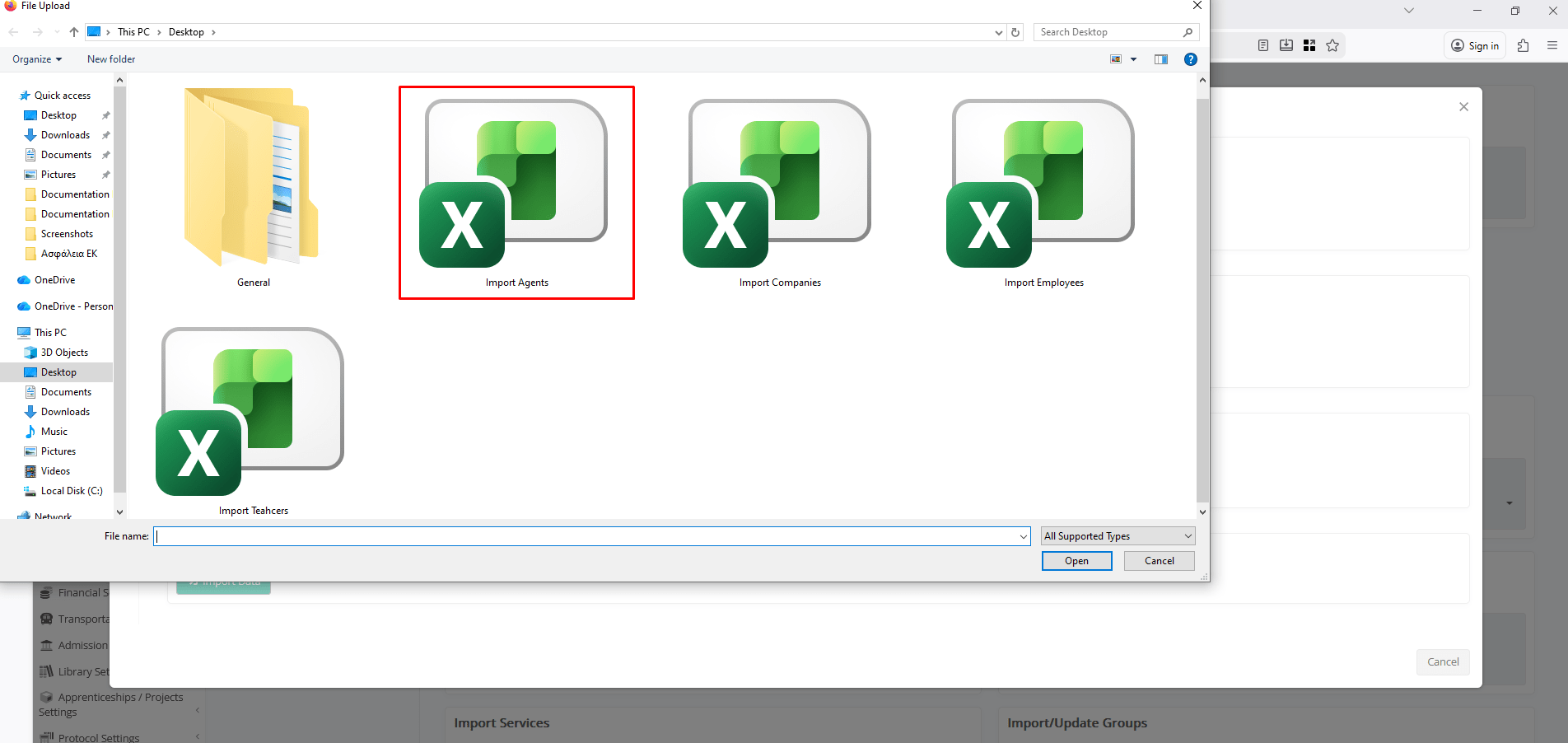 - Import Agents: Used to import Agent records, allowing institutions to manage external representatives involved in _Student_ recruitment, applications, and related financial processes.