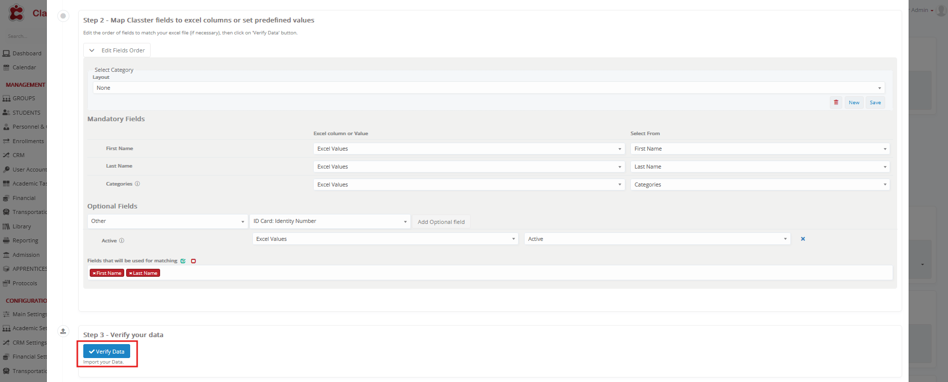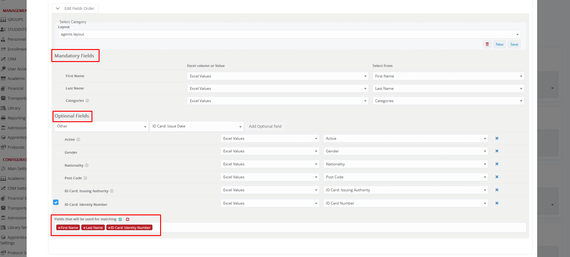 Click Edit Fields Order to start the mapping process. You can either select a previously saved layout or create a new one to map the Excel columns with the corresponding Classter fields.