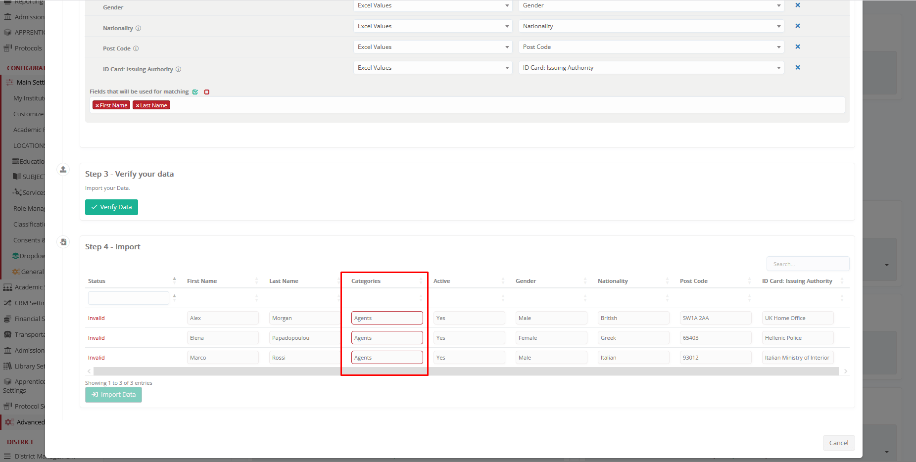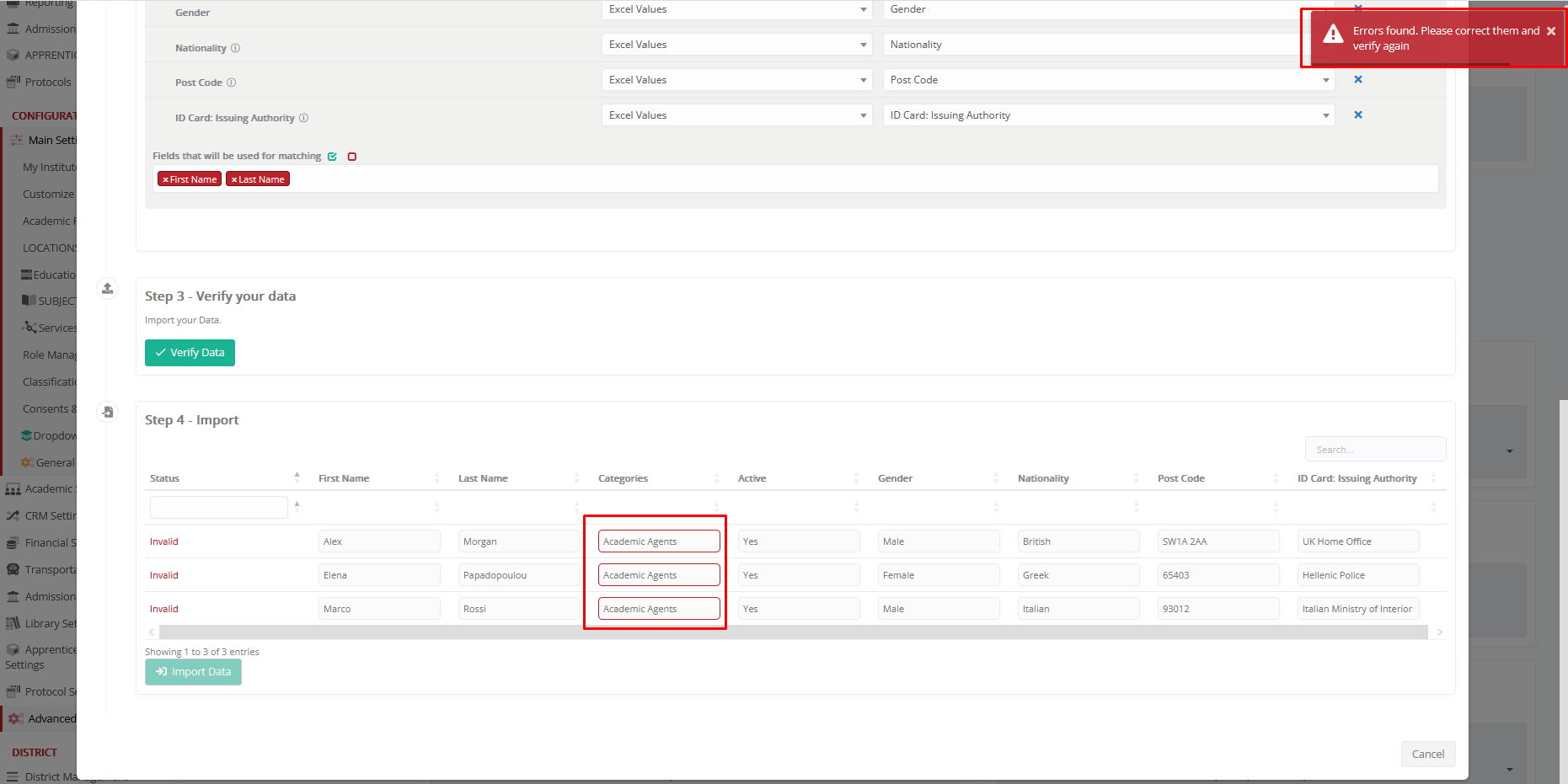 In this example, the Category configured in the system is “Academic Agent”, while the Excel file uses the value “Agents”. Since the value in the Excel file does not exactly match an existing Category, the system fails validation and the import cannot proceed.