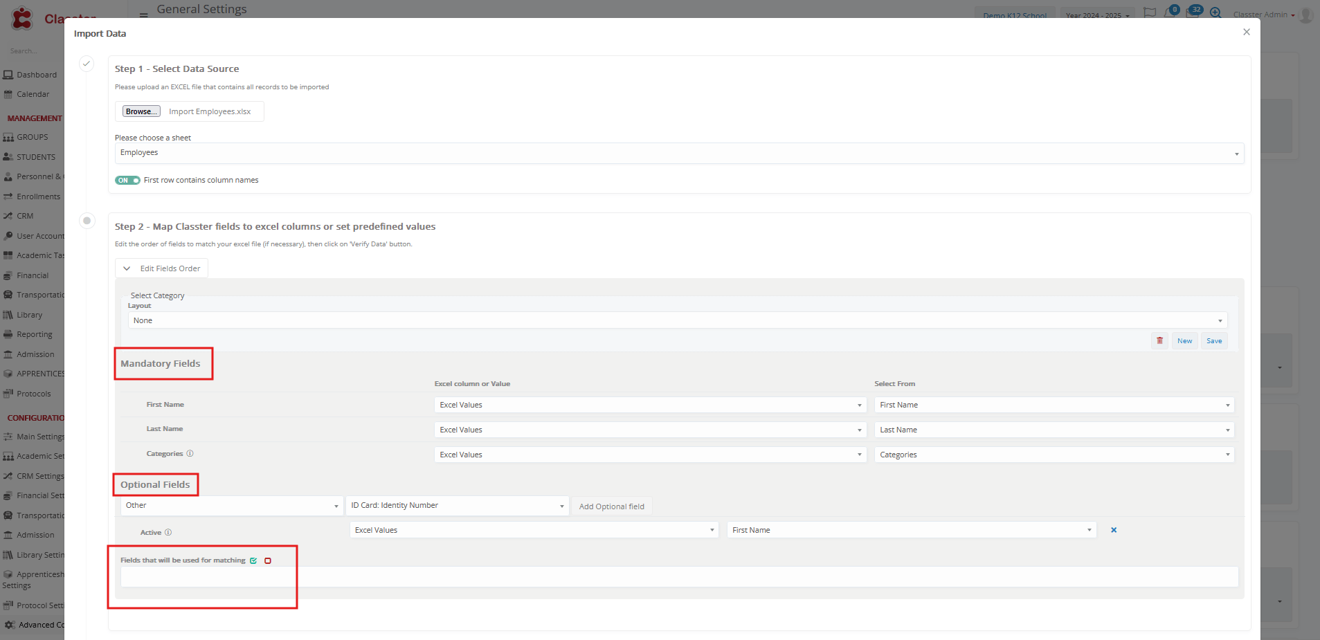 These fields must be mapped correctly to proceed. Notably, Classter provides the option to use either Excel Values or User Values for mapping: