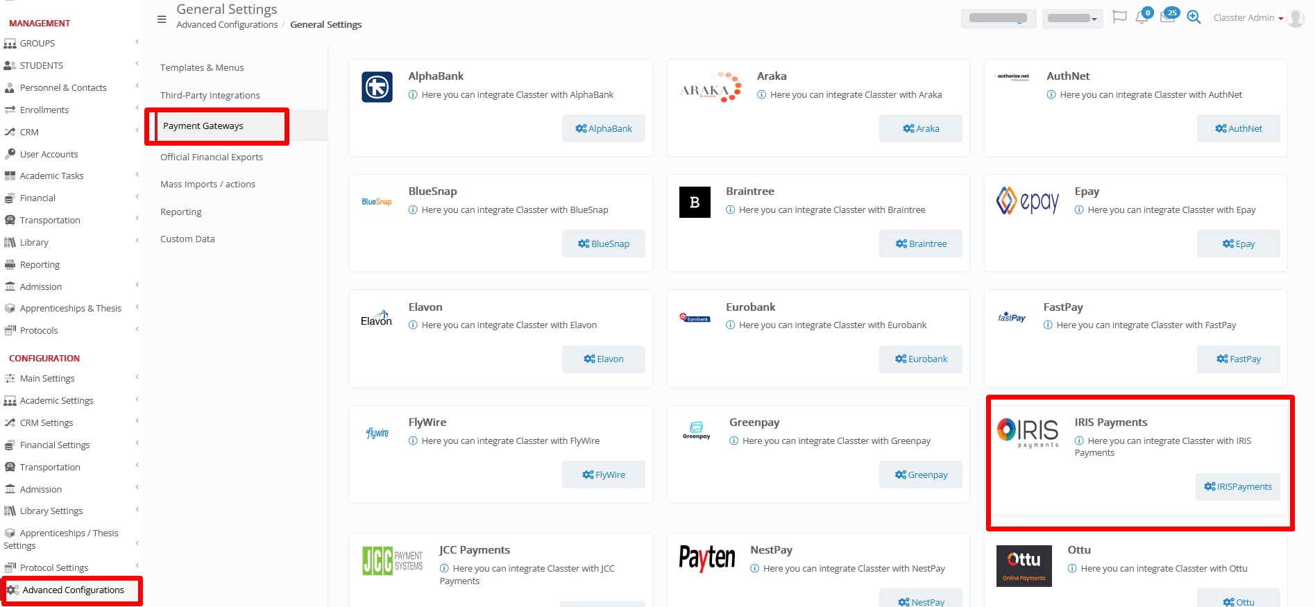 Navigate to Advanced Configurations > Payment Gateways > IRIS Payments