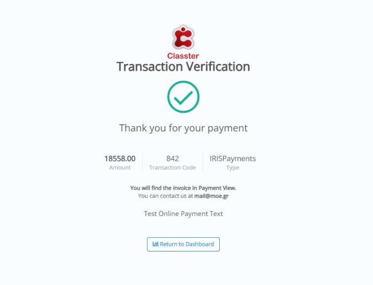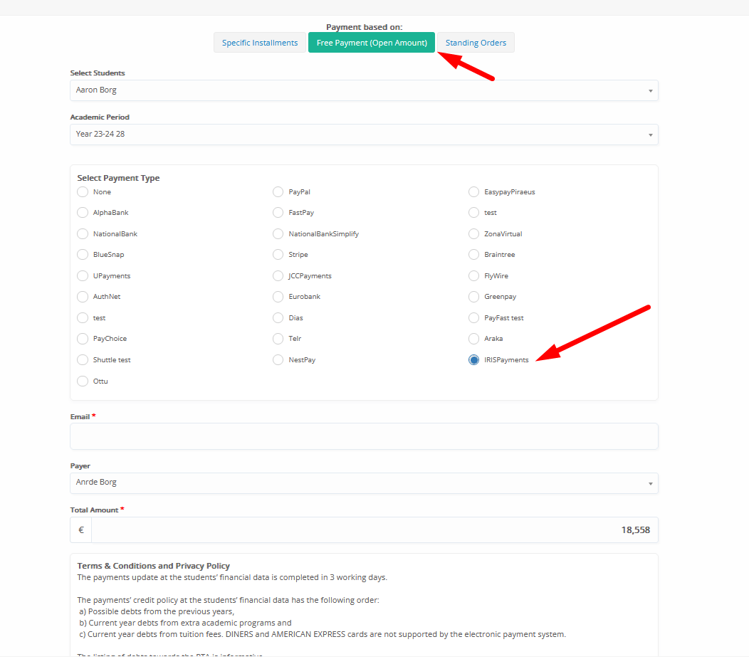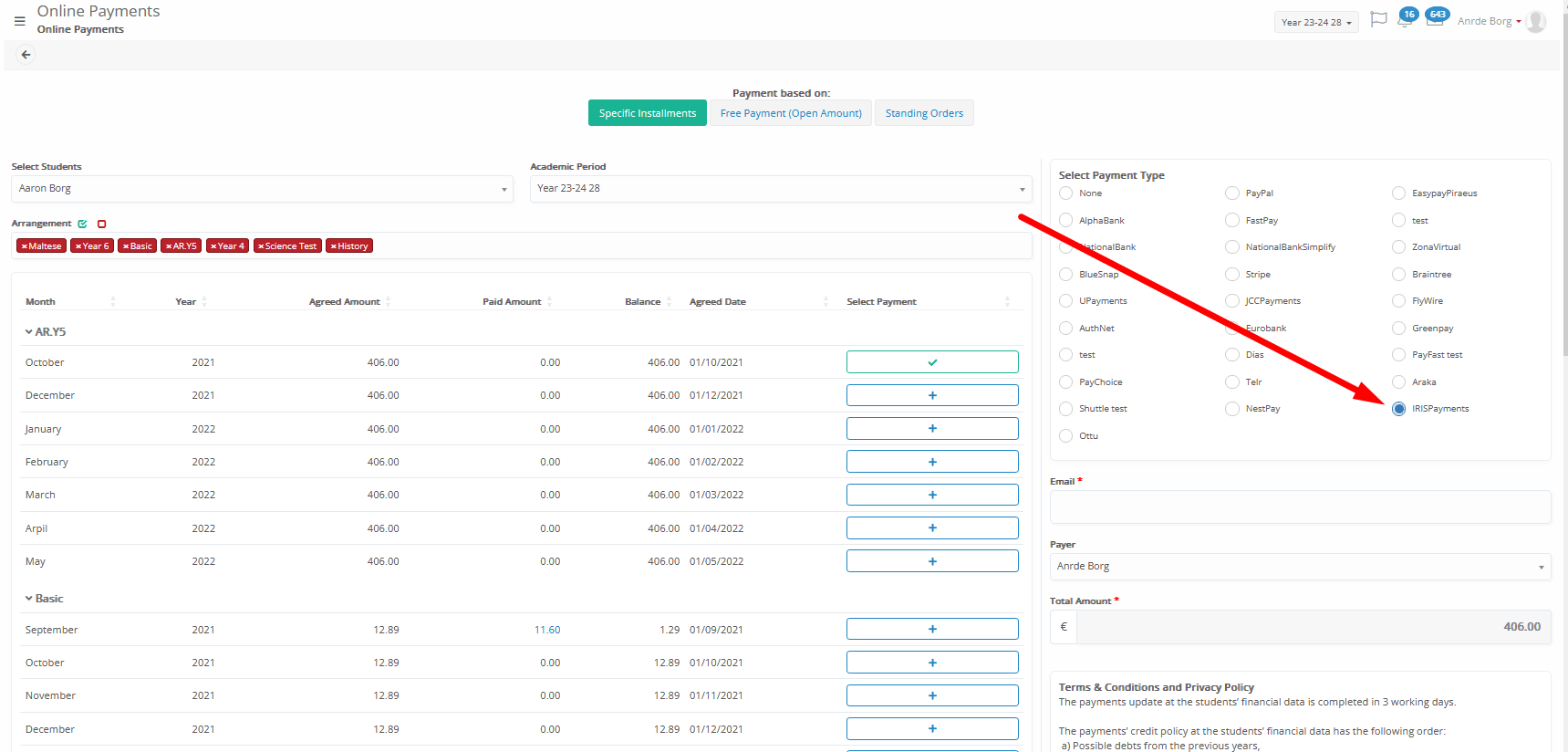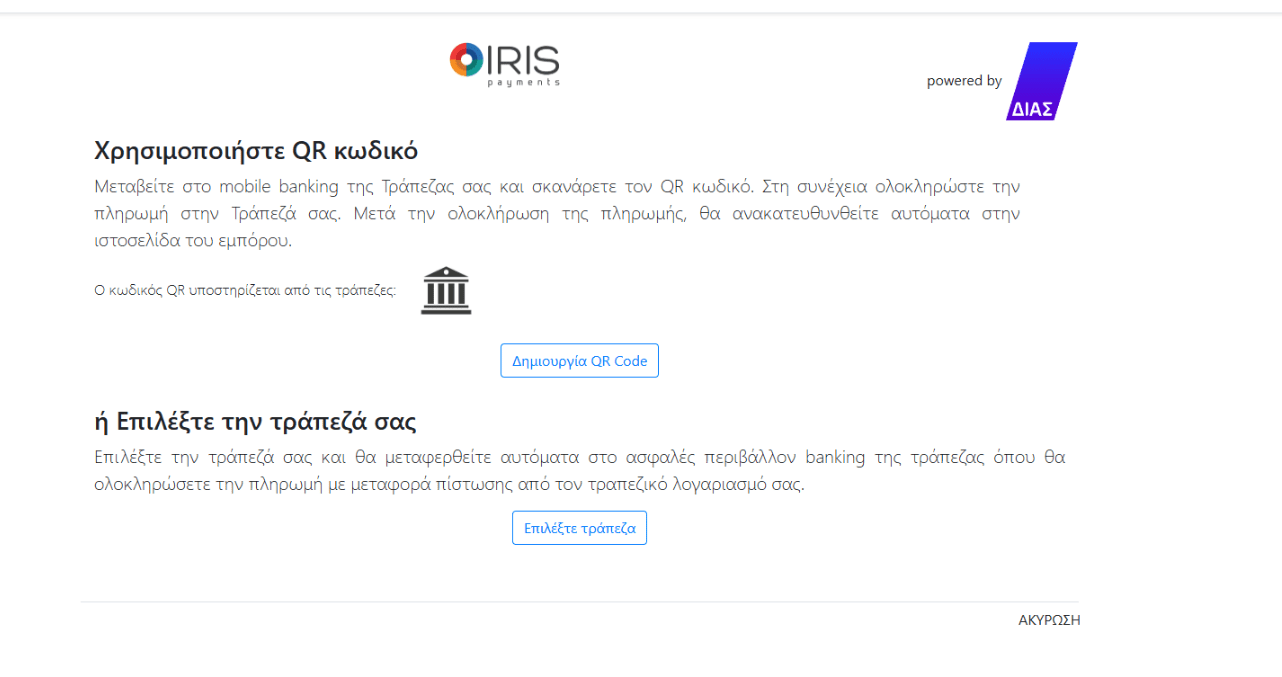 The IRIS payment gateway is integrated through DIAS, allowing users to make secure online payments via e-banking or QR code directly through their portal.