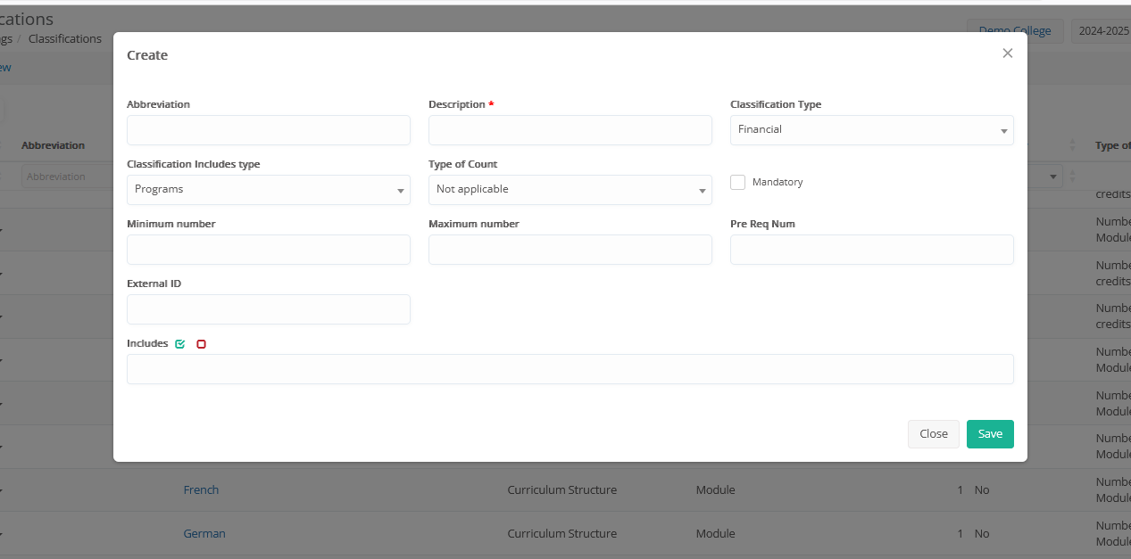- “Curriculum Structure” (used in Curricula for College mode. Usually, these classifications are not created from this screen, but through the curricula structure configuration.)