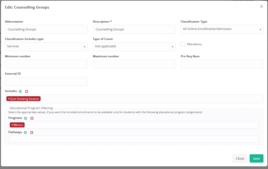 - Includes Type*: In relation with the classification type, specify what the classification/grouping will include (e.g. subjects, services, grades/programs).