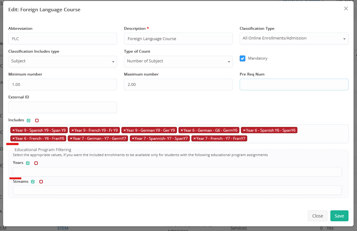 - Group subjects or services, with minimum-maximum limitations and grade/program filters, to use them in online enrollments. E.g. “Year 12 electives”, connected to Year 12 grade, mandatory to enroll, with min=1 and max=2 enrollment limitation. Or “Seminars”, connected to ‘Marketing’ and ‘Healthcare’ programs, optional but with a limitation to maximum=5 seminars to enroll for the academic period.