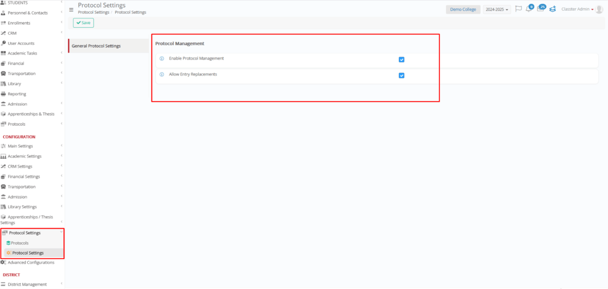 - Enable Protocol Management: Turns on the protocol module.
