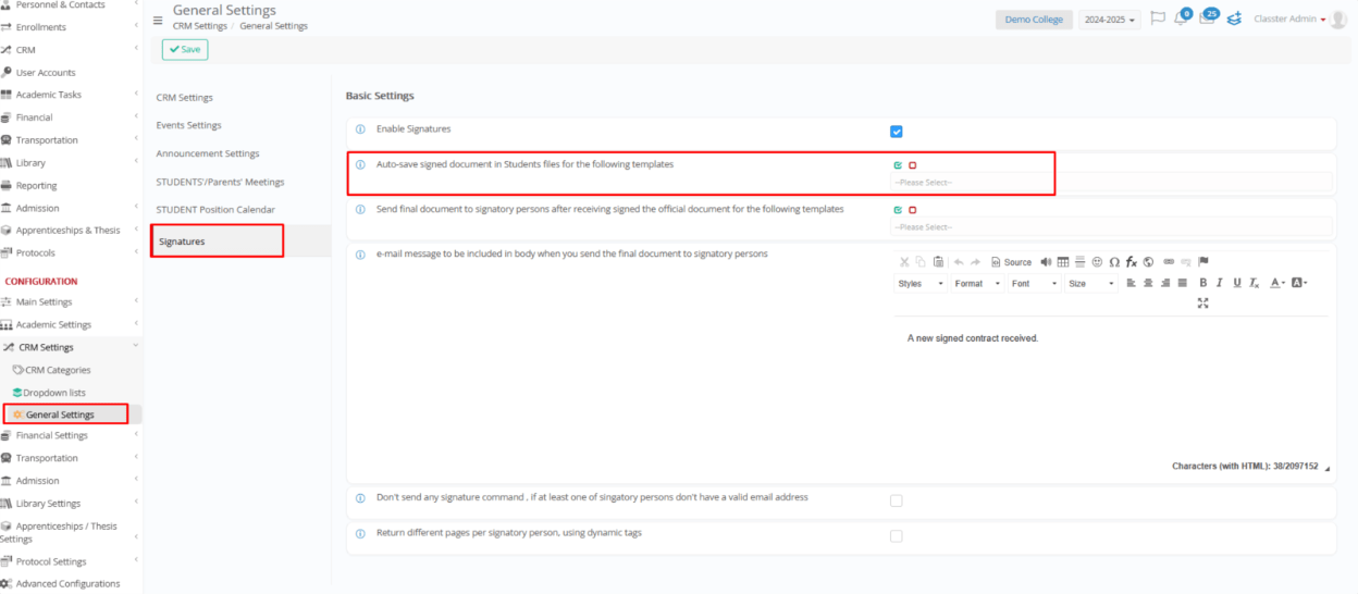 Note: To enable automatic saving of signed documents in the student files, go to Configuration > CRM Settings > General Settings > Signatures and select the templates under “Auto-save signed document in Students files for the following templates”. Do not forget this step—it ensures that the system saves documents in the correct location.