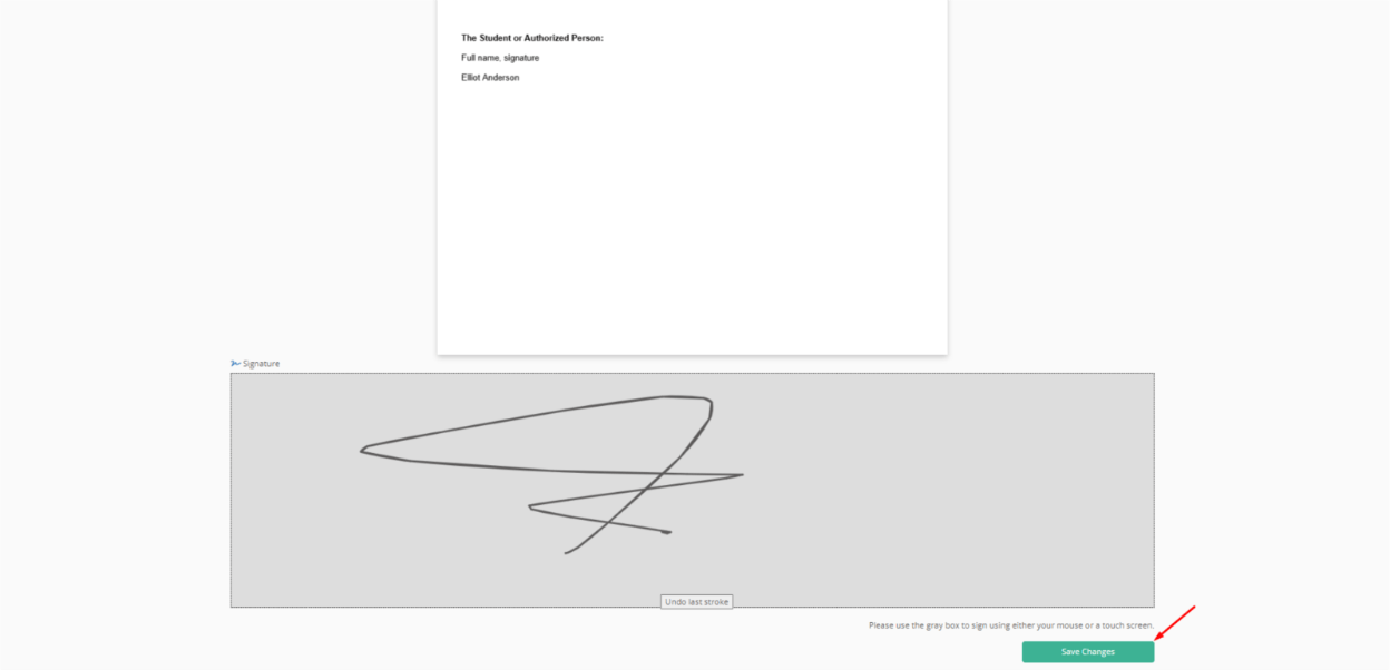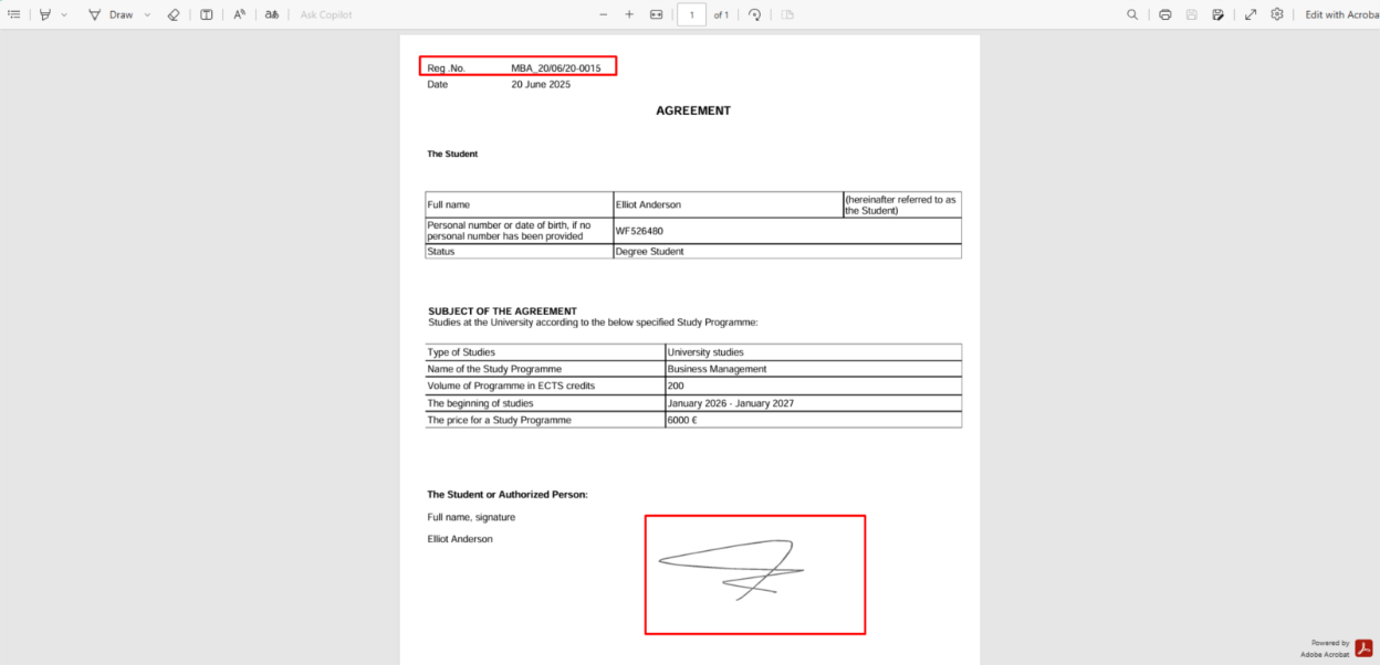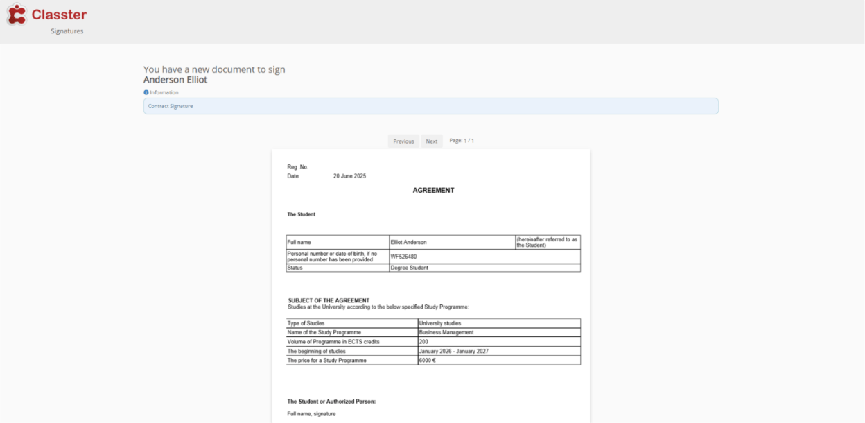 This example shows how the document appears when a student receives it for signing. The system sends it directly to the signatory via email for review and action.