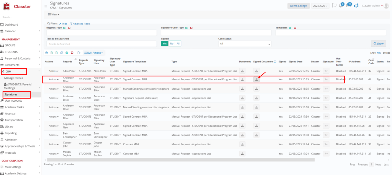- Or go to CRM > Signatures, select the signed document, and click the download button.