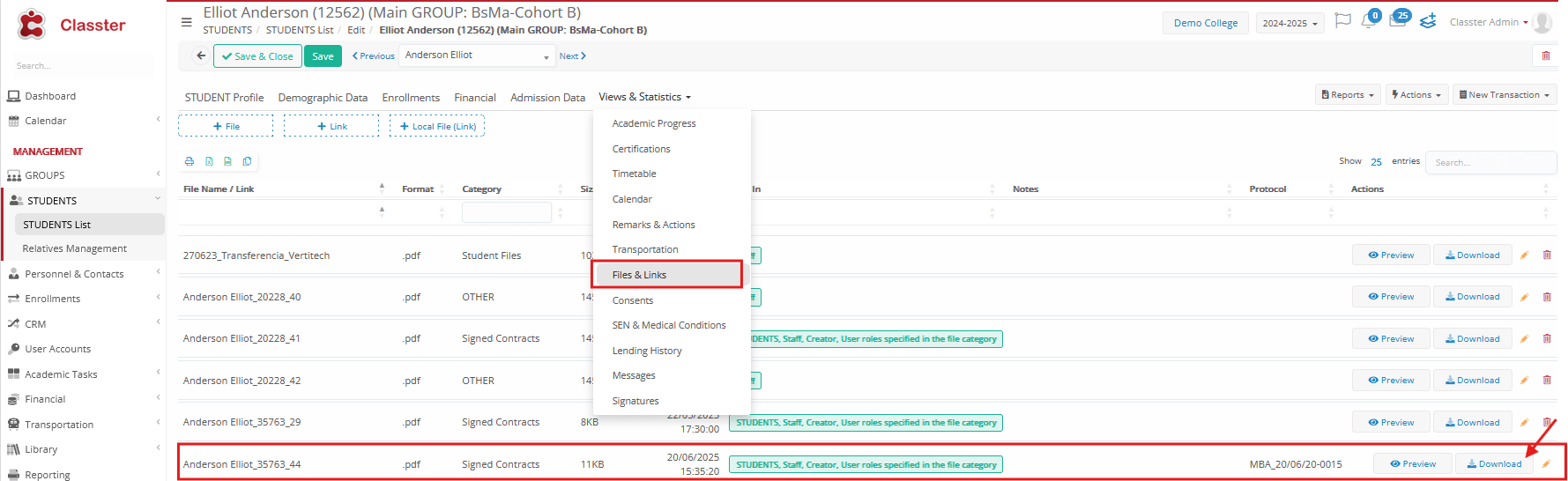 - Alternatively, you can navigate to the Student List, open the student’s profile, and download the signed document from the Files & Links tab.