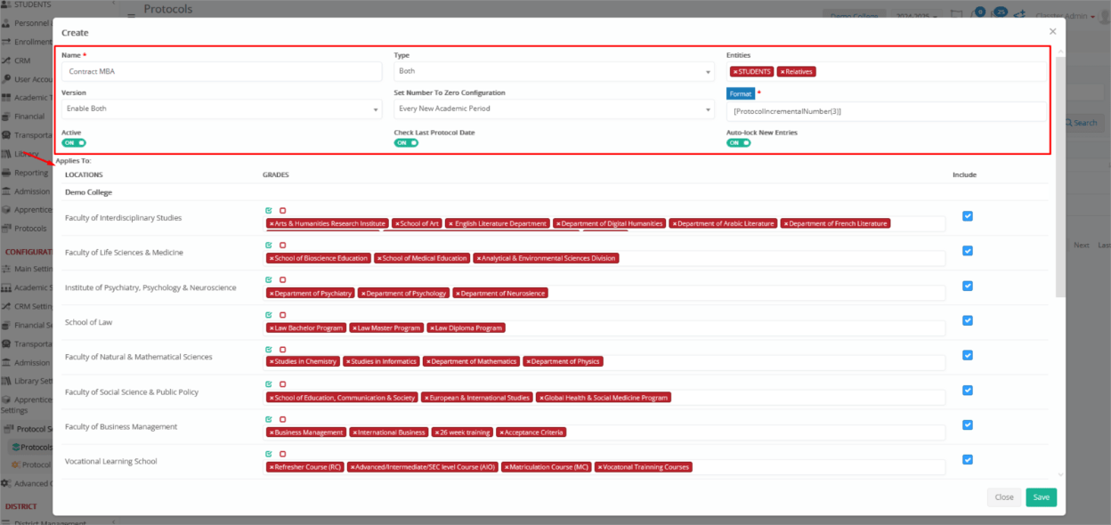- Entities: Select the applicable entities this protocol will be associated with (e.g., Students, Relatives, Employees, Suppliers, Groups, Contracts).