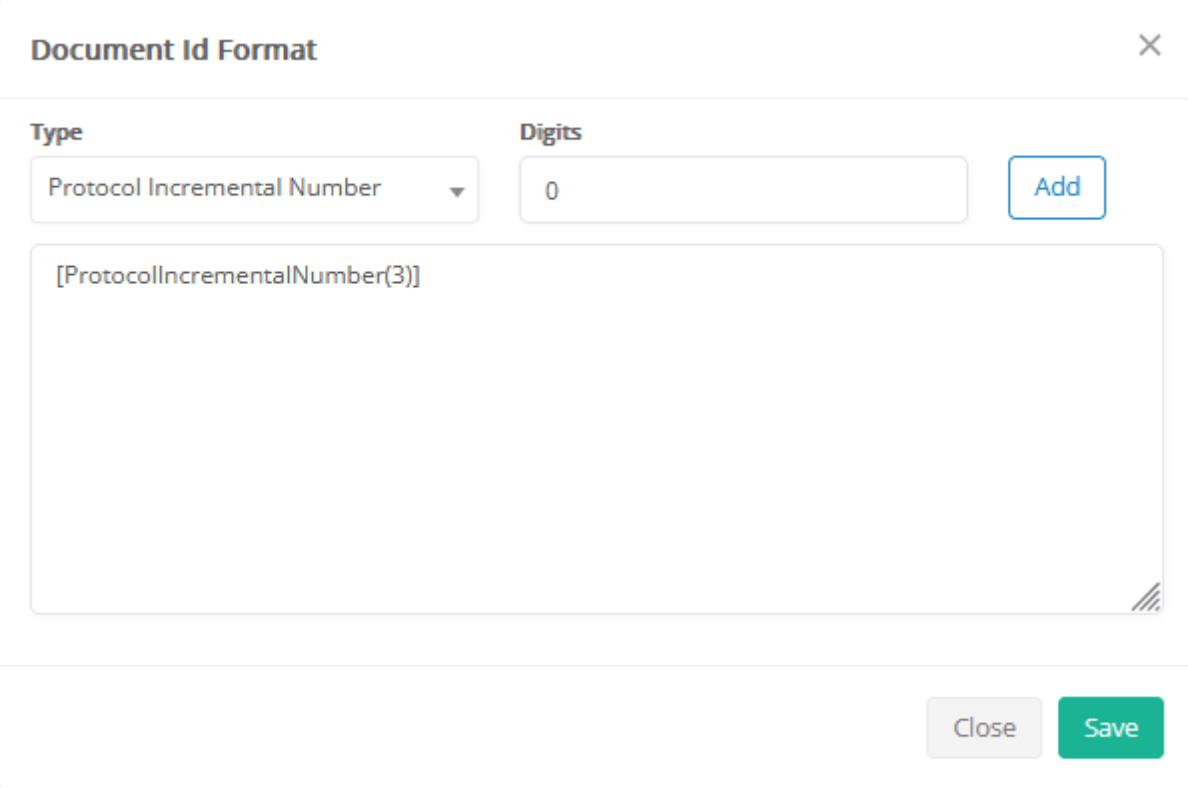 - Digits: Set the number of digits in the incremental part of the protocol number (e.g., 3 = 001, 4 = 0001).