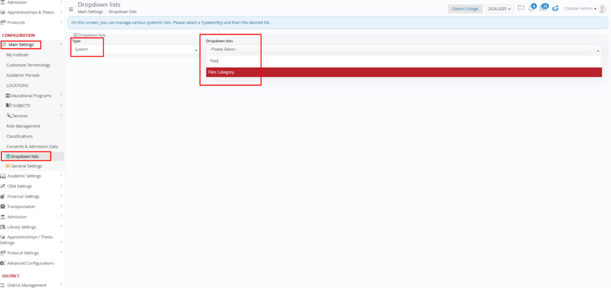 Navigate to: Configuration > Main Settings > Dropdown Lists