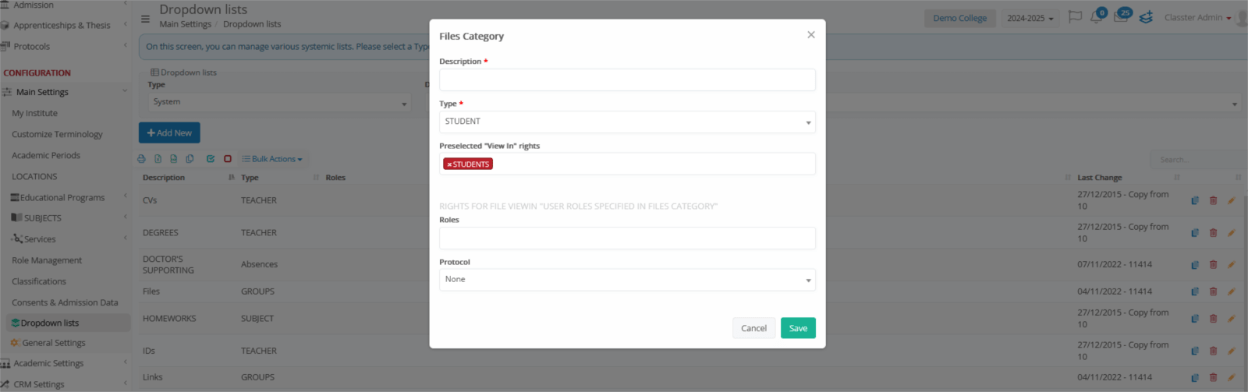 - Files Category: Must be created in Main Settings > Dropdown Lists > Type: System & Dropdown List: Files Category related to Signatures. Can also be linked to a protocol