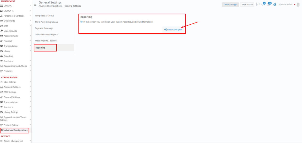 Navigate to: Advanced Configurations > General Settings > Reporting > Report Designer