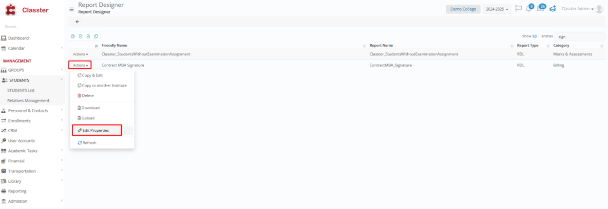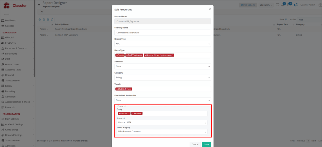 - Report: Select the right report from the existing reports created under Advanced Configurations > Reporting > Report Designer. (If no suitable report exists, please contact Classter to have a custom report created based on your needs.) This report will be converted to PDF and sent to the signatory.
