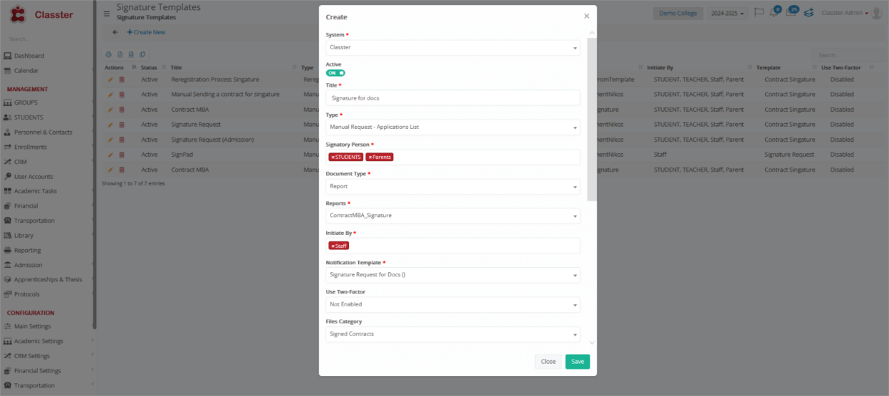 - Type: The type determines the list or area in Classter where the signature request will be available.