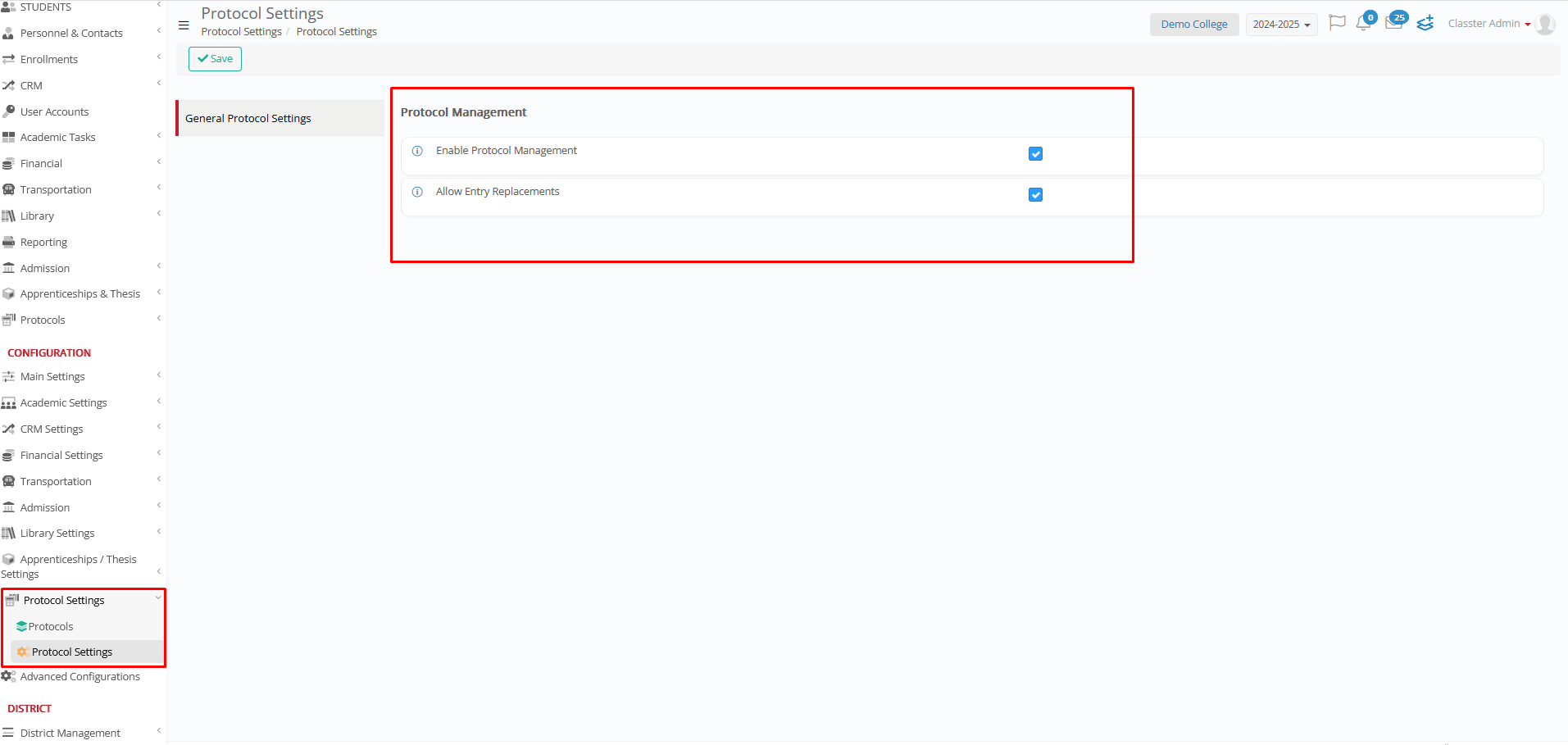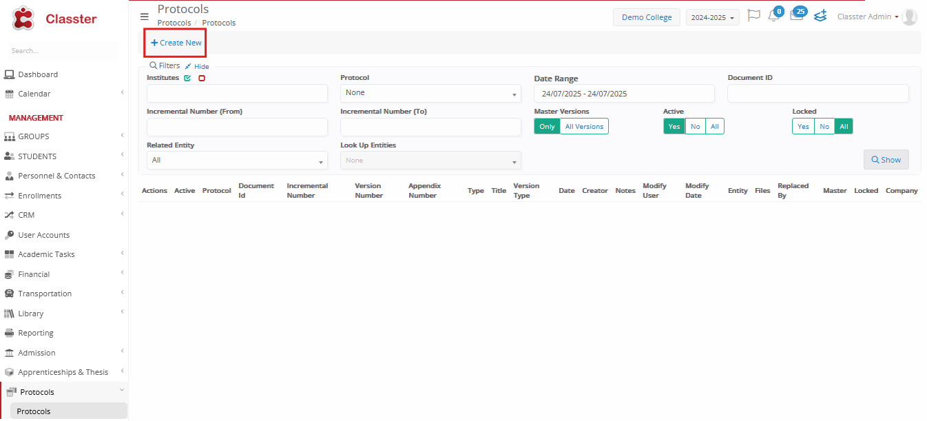 The Protocols Module in Classter provides institutions with a structured way to assign protocol numbers—custom-formatted, incremental identifiers—used to track official documents and administrative actions. These protocol entries function as a digital logbook, enabling users to manage files, record key communications, and maintain a reliable audit trail.