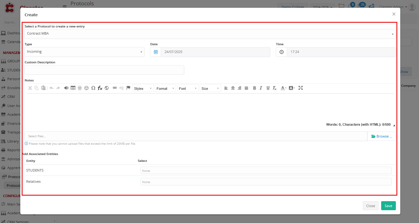 - Associated Entities: Link one or more entities (e.g., Student, Employee, etc.) relevant to this entry.