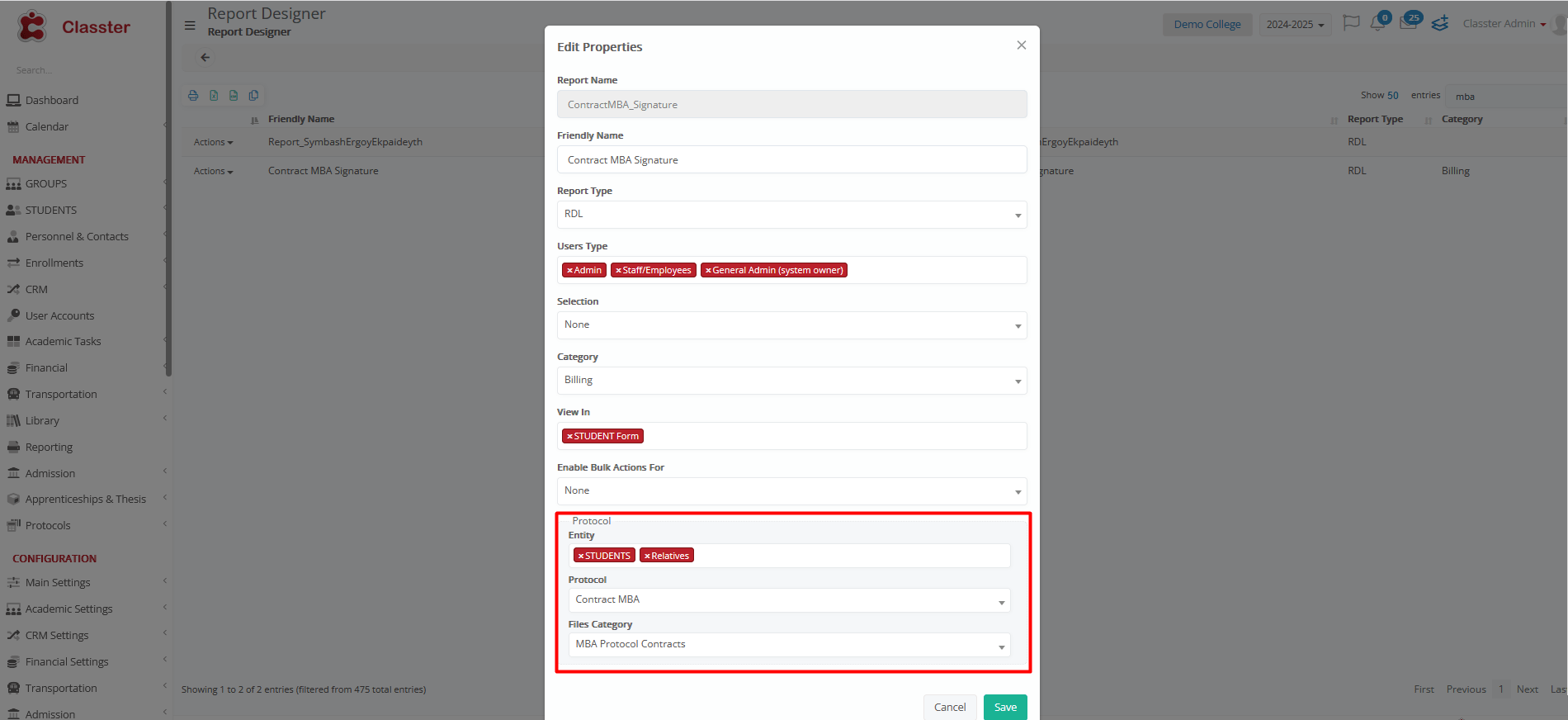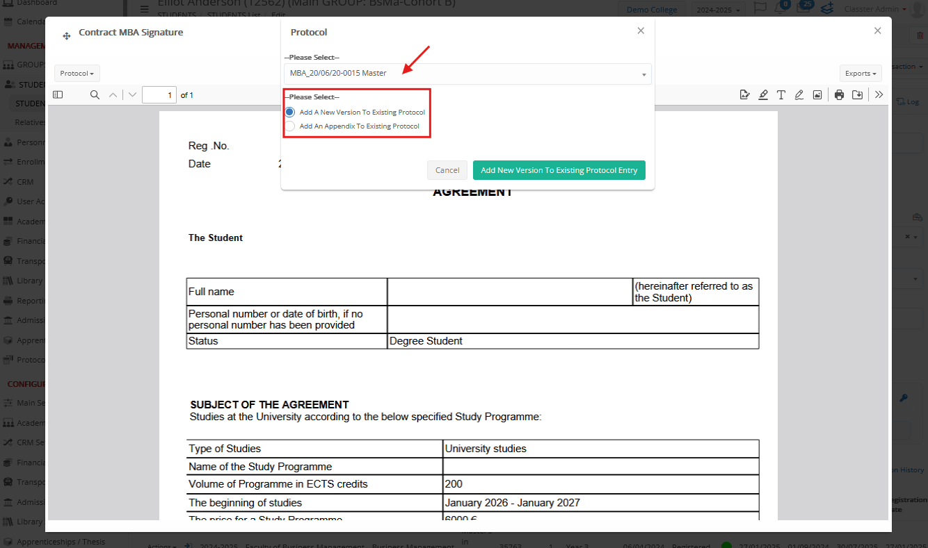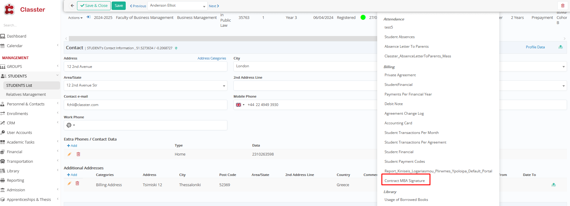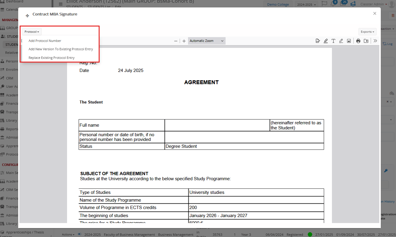 For example, navigate to: Students > Student List > [Select Student] > Reports > find the report you are interested in: Contract MBA Signature > Protocol to access protocol-related actions.