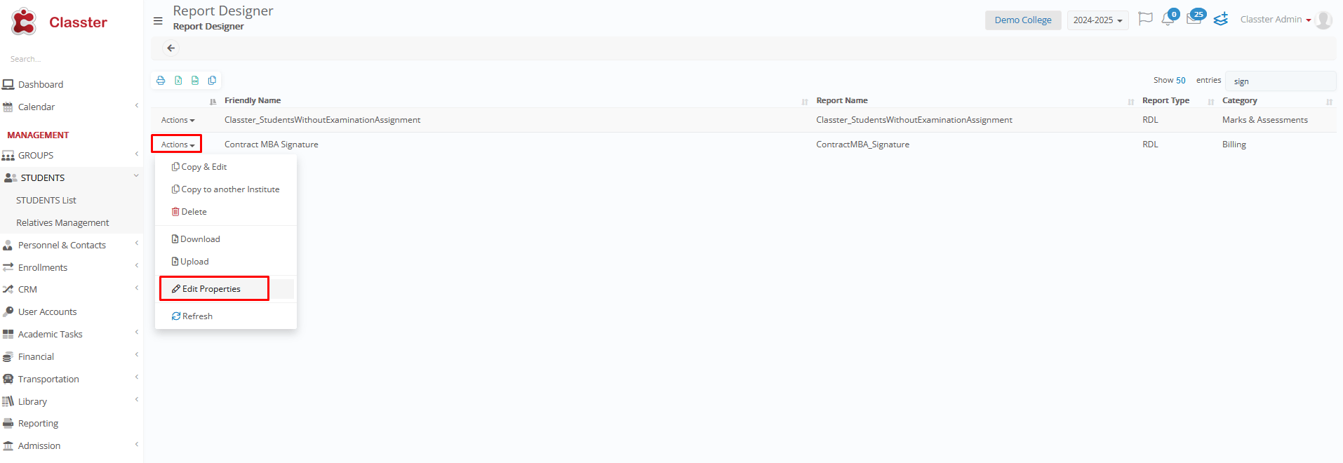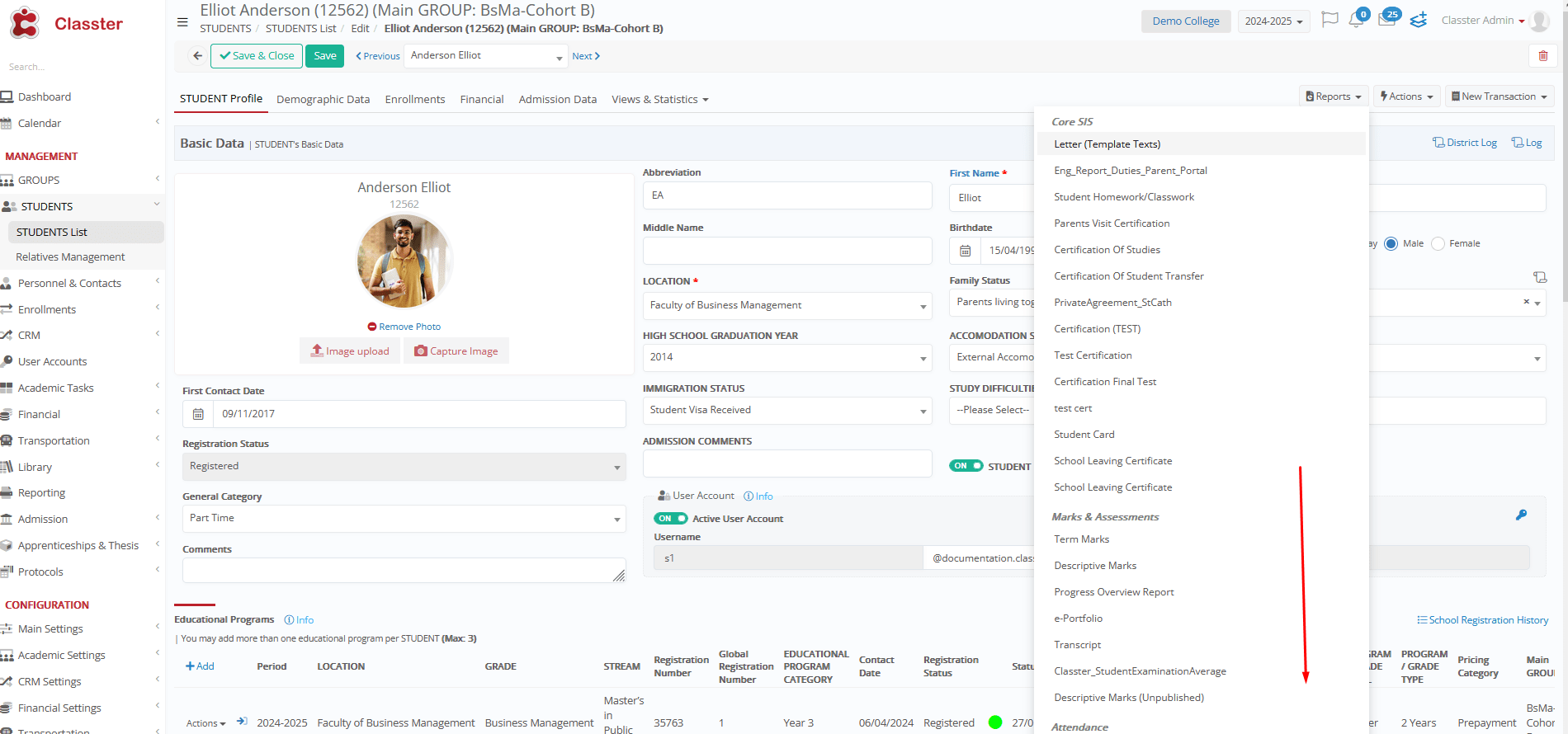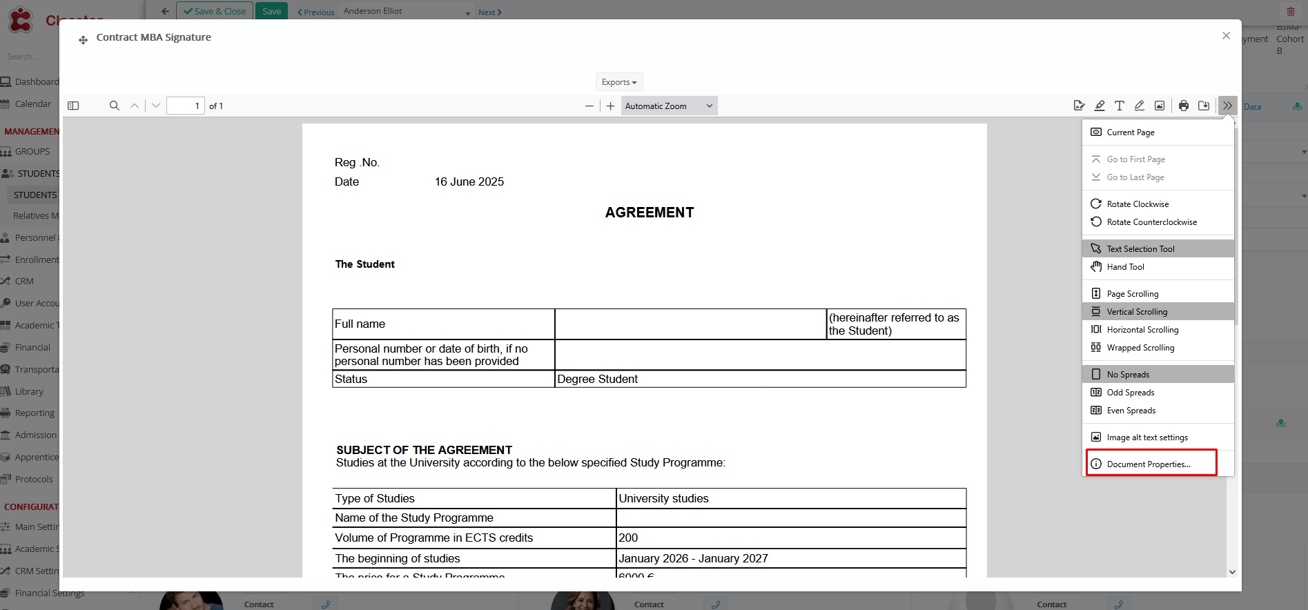 For example, navigate to: Students > Student List > [Select Student] > Reports > find the report you are interested in: Contract MBA Signature > Protocol to access protocol-related actions.