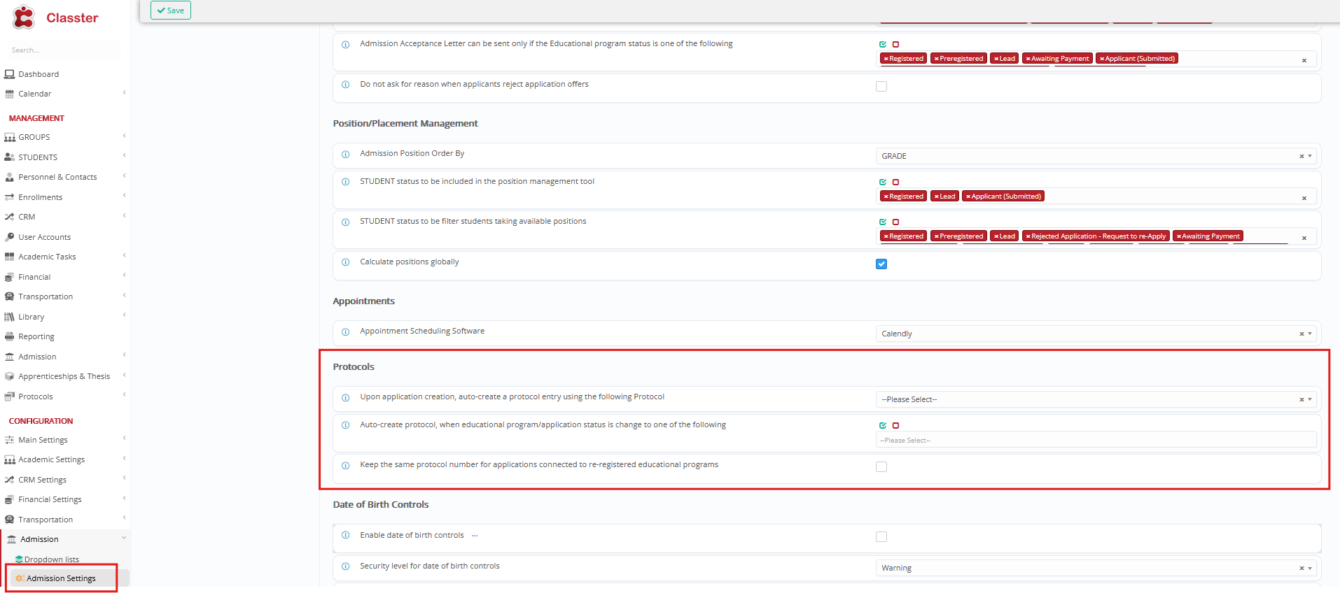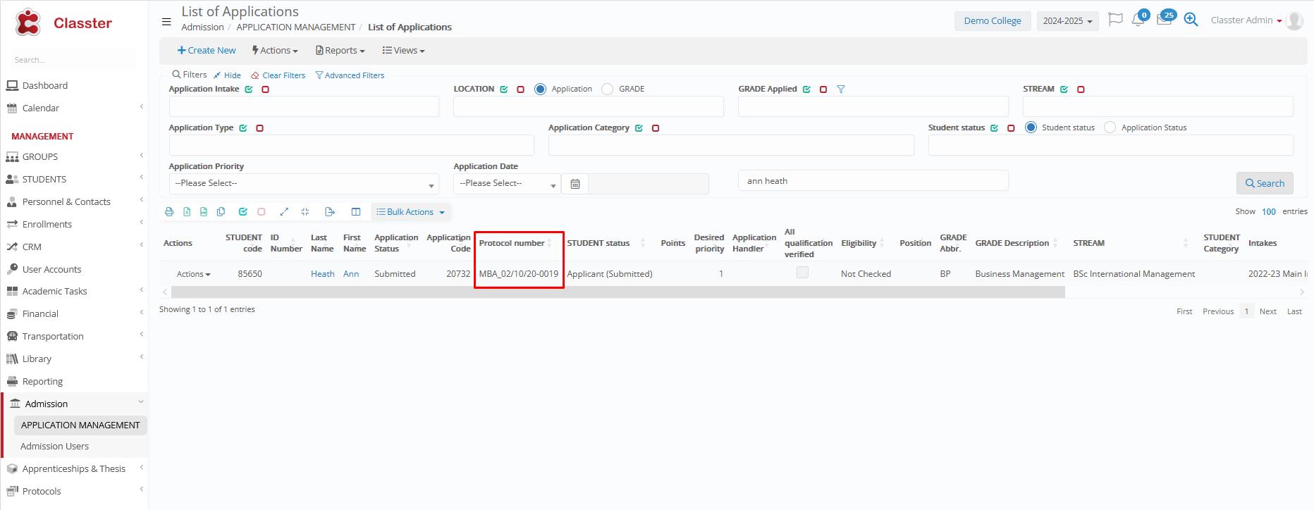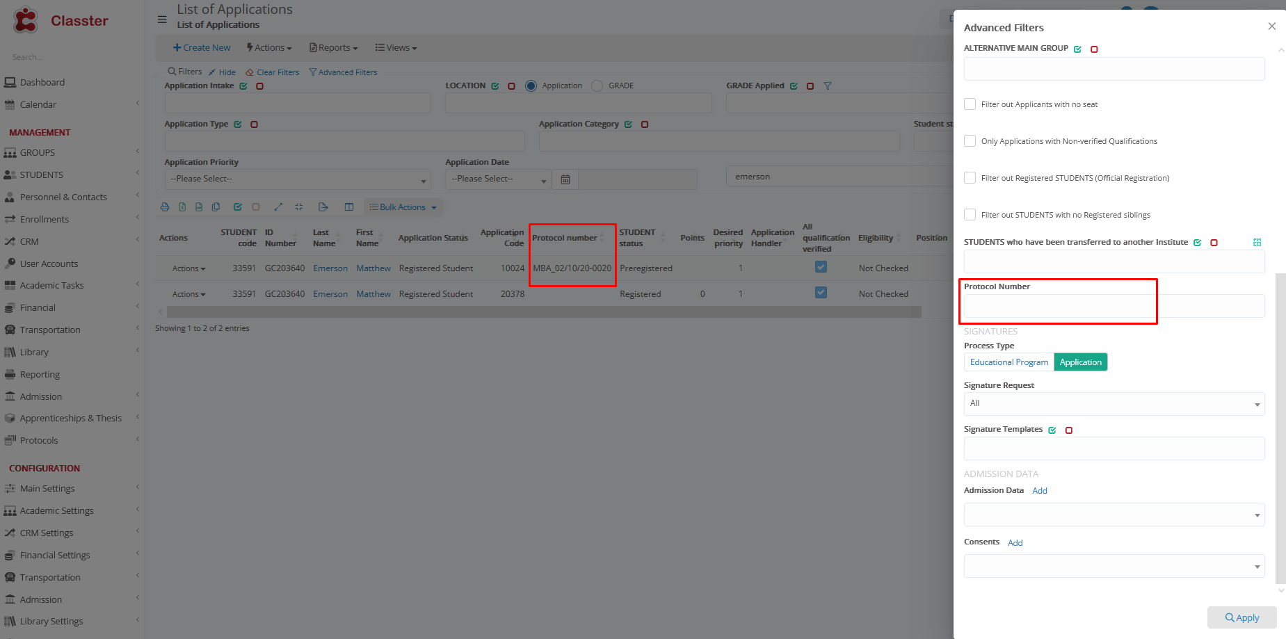 Classter lets you use the Protocols Module for application tracking. Each student application can get a unique protocol number based on your rules. This makes applications official, traceable entries—even without documents.