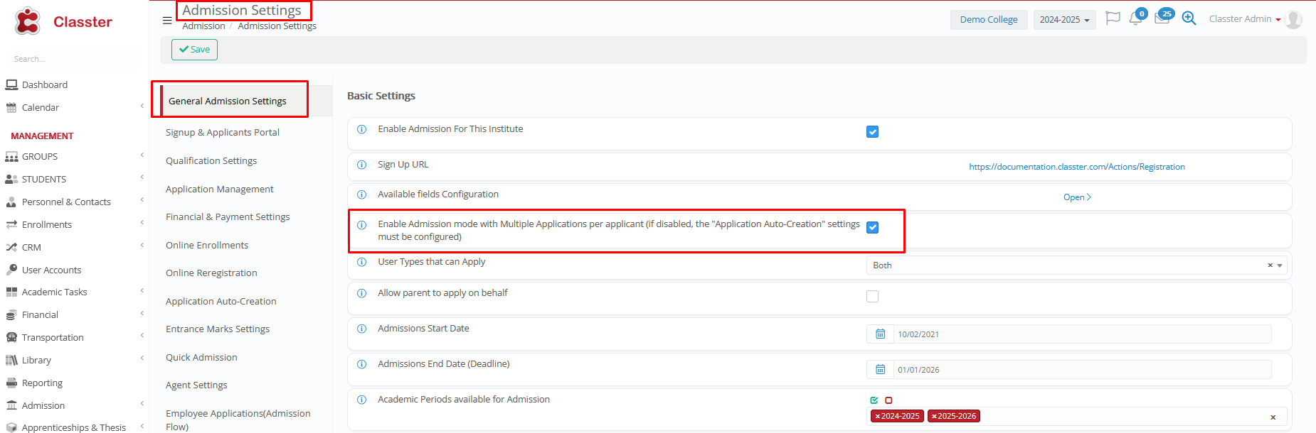 Note: This is visible only when multiple applications are enabled for this institute. (image below)